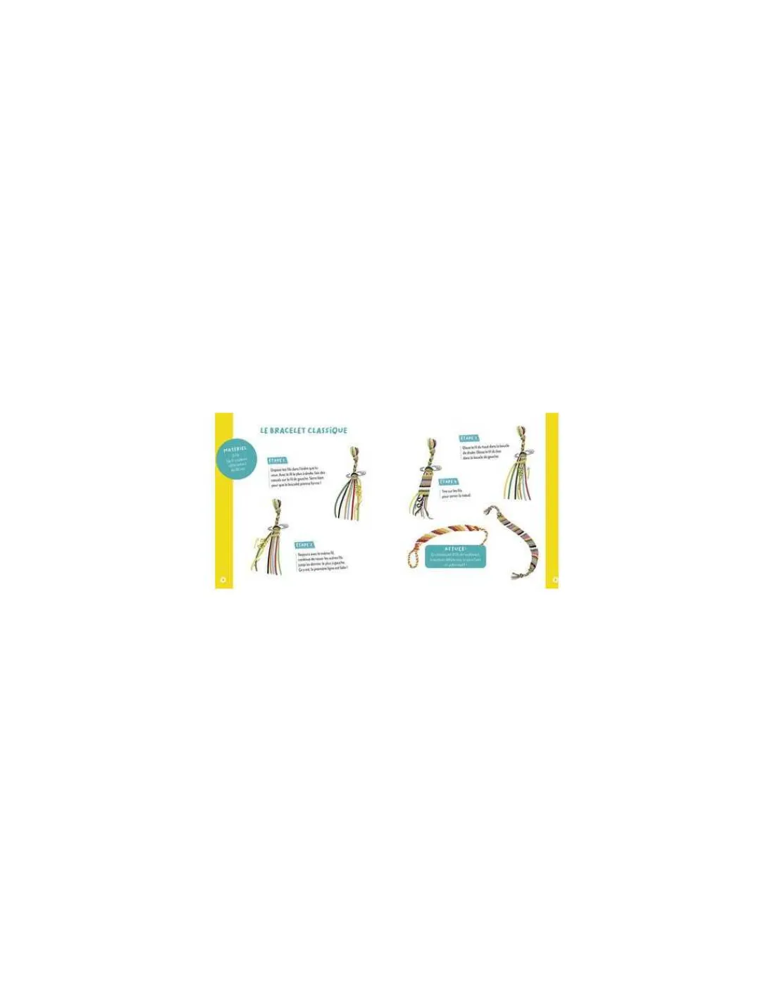 Le coffret cadeau comprend 15 fils de couleurs différentes pour réaliser de multiples créations et un livret de pas à pas avec 10 exemples de modèles de bracelets à réaliser.