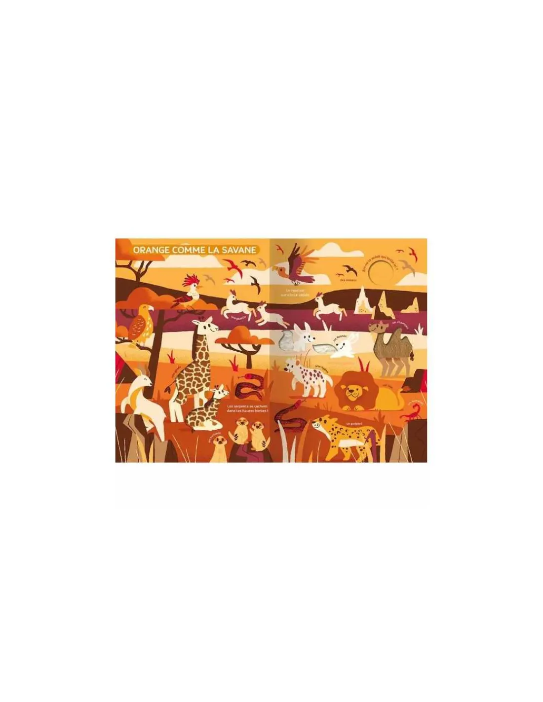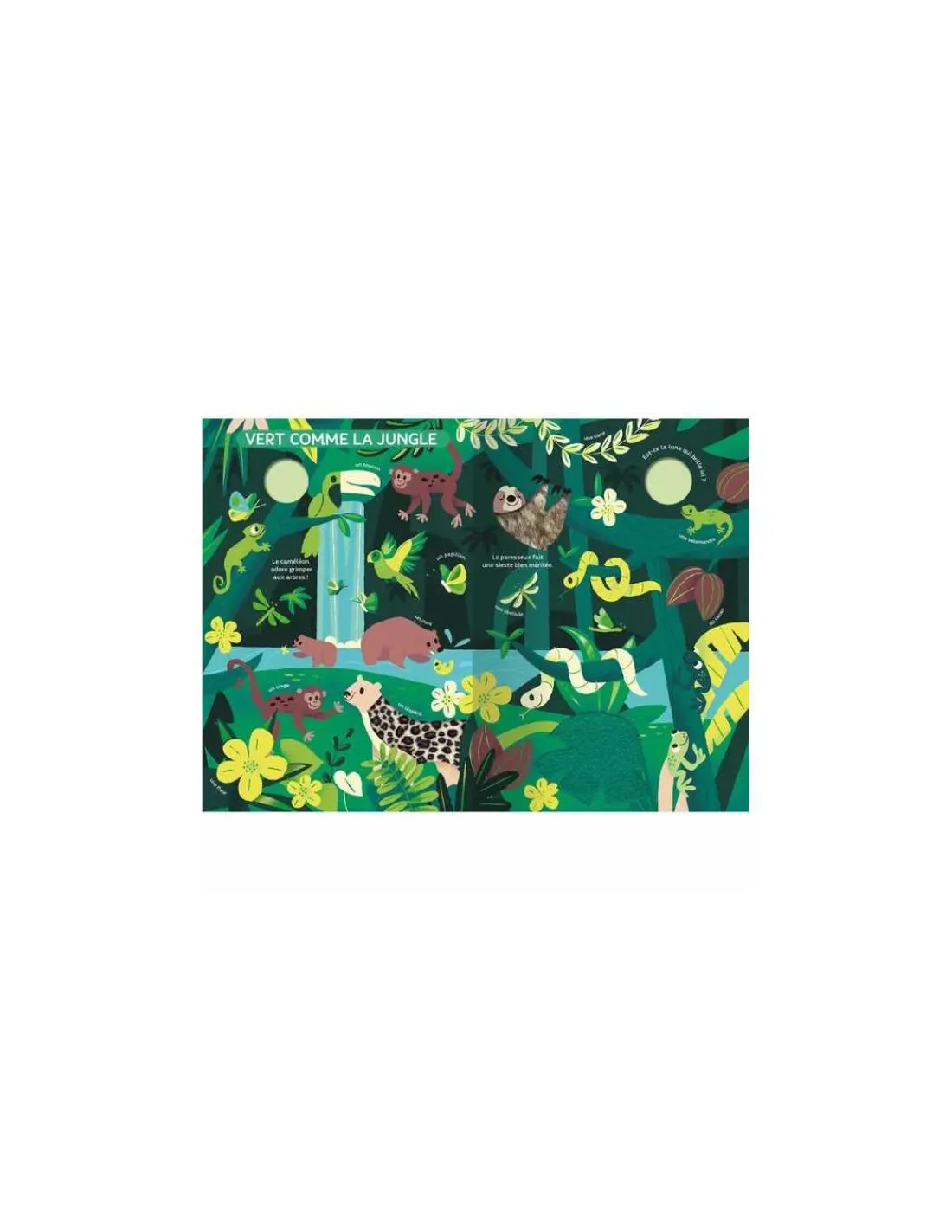 Un magnifique livre au format géant avec plus de 20 matières à toucher au fil des pages et qui peut se transformer en tapis d’éveil. Le tout-petit découvre même un miroir à la fin ! Ce livre géant aborde le thème incontournable des couleurs : Bleu comme l’océan, Orange comme la savane, Vert comme la jungle et Violet comme la ville.