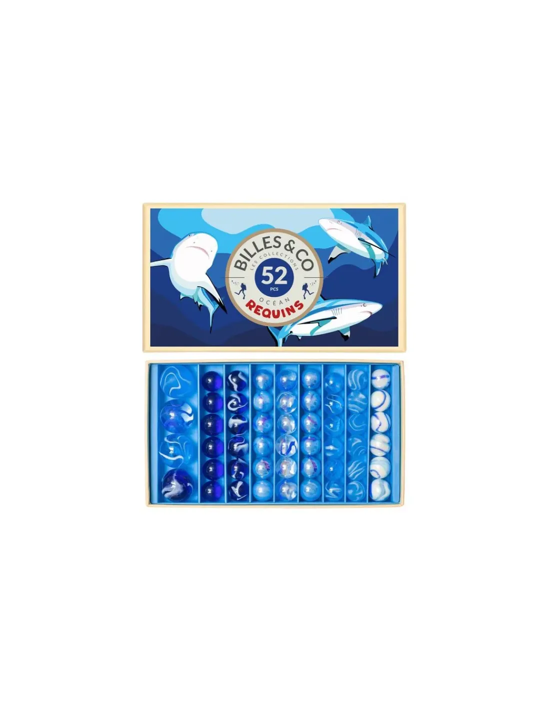 Découvrez le coffret de 52 billes Requin de Billes & Co, 48 billes de 16 mm et 4 calots de 25 mm dans les tons bleus rangés dans un splendide coffret cadeau. Billes & Co met en valeur ces petites boules de verre avec lesquelles tous les enfants ont joué afin d’en faire des “trésors de pierres précieuses”.