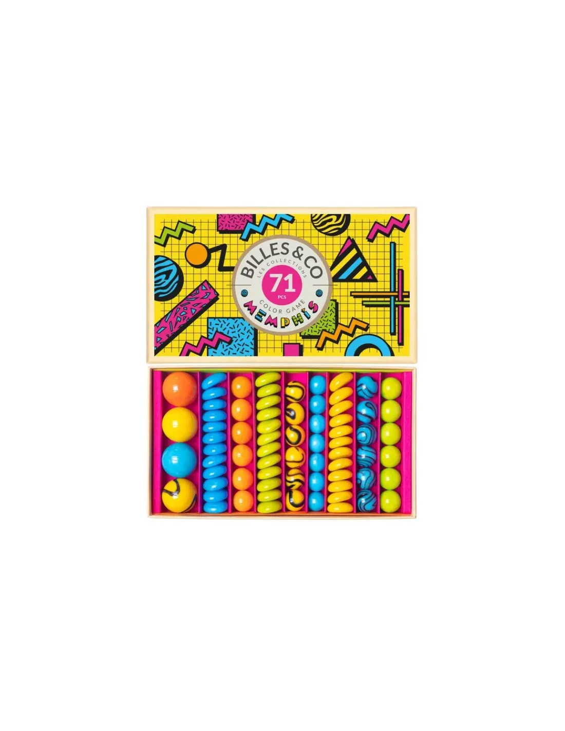 Découvrez le coffret de 71 billes FMemphis de Billes & Co. Billes, calots et galets flamboyants dans un splendide coffret cadeau. Billes & Co met en valeur ces petites boules de verre avec lesquelles tous les enfants ont joué afin d’en faire des “trésors de pierres précieuses”.