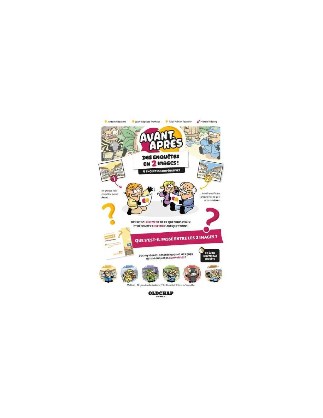 Découvrez le jeu Avant Après de Oldchap Games, un jeu d’ambiance pour jouer de 2 à 6 joueurs, à partir de 10 ans avec 6 enquêtes drôles et coopératives à résoudre. Un jeu d’enquête en deux images!