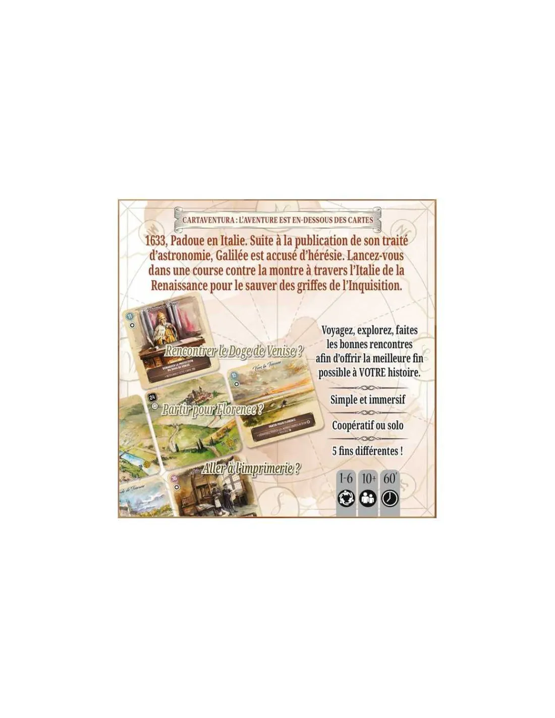 Cartaventura propose des aventures historiques au format poche, façon « Livre dont vous êtes le héros ». Les joueurs construisent leur aventure à l’aide de cartes qui proposent différentes options. Ils réfléchissent ensemble aux meilleurs choix afin de suivre la trace du héros du jeu. Grâce à des scénarios riches et de magnifiques illustrations à l’aquarelle, ils sont véritablement immergés dans différentes époques de l’Histoire. Le système de jeu, simple et inédit, permet de rejouer chaque scénario plusieurs fois afin de découvrir toutes les fins possibles.