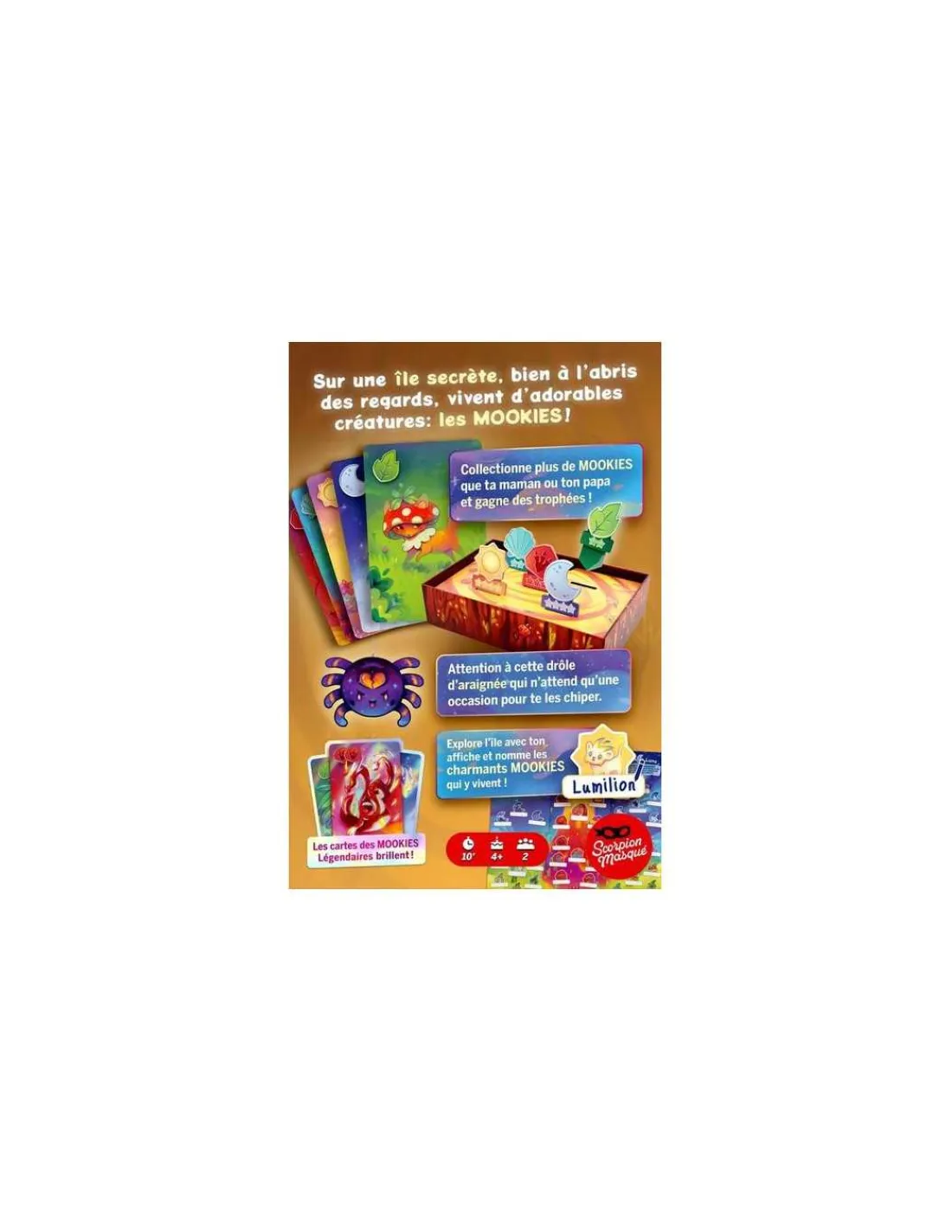 L’île des Mookies est un jeu à 2 pensé pour captiver les enfants de 4 à 10 ans. C’est LE jeu qui va réunir parent et enfant autour de moments uniques et complices. Ajoutez à cela 60 petits monstres mignons, impressionnants, originaux, parfois évolutifs et vous obtenez un jeu qu’enfants et parents vont adorer.