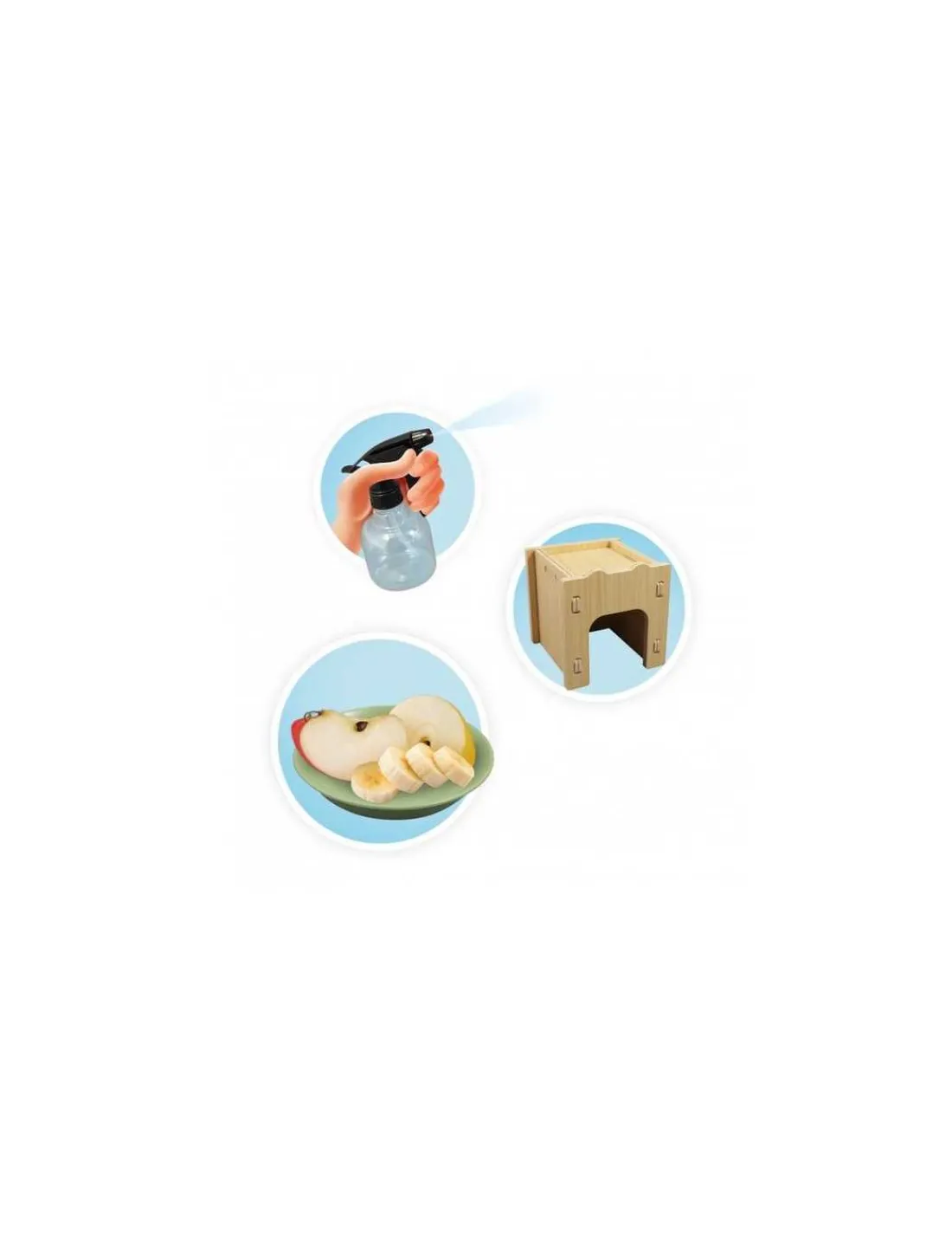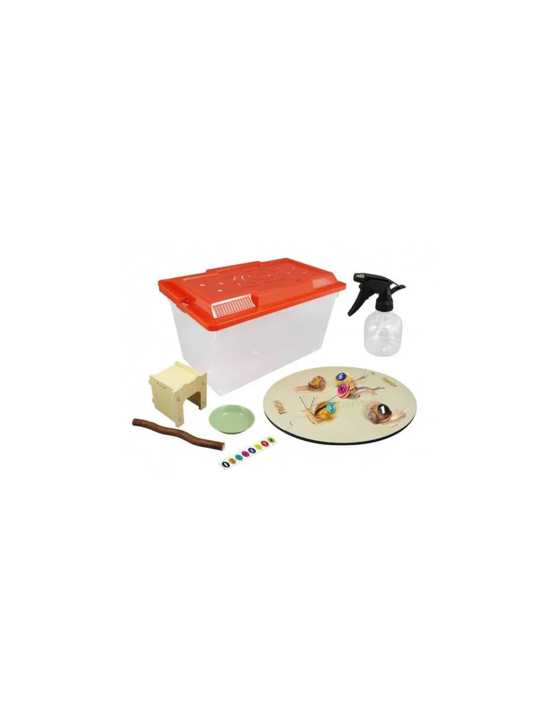 Un habitat spacieux pour accueillir les escargots de votre jardin. Votre enfant s’amusera à créer un havre de paix avec un refuge en bois à assembler. Brumisez et humidifiez l’habitat et vos escargots avec le spray à eau inclus. Puis, organisez des courses d’escargots : assemblez la piste et top départ!
