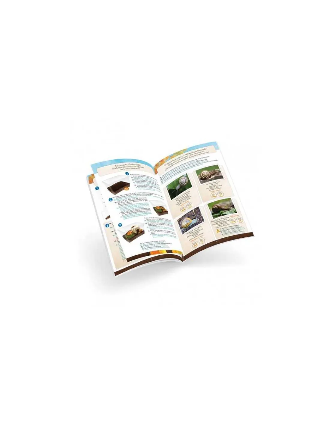 Le coffret contient 1 habitat, 1 spray à eau, 1 refuge à assembler, 1 coupelle pour la nourriture, 1 piste en bois, des autocollants et 1 notice illustrée en couleurs.