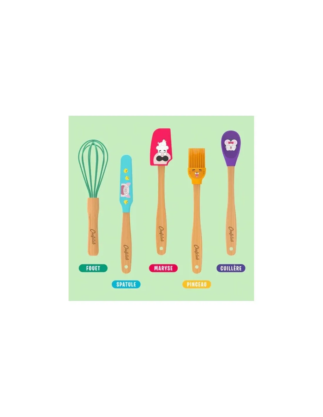 Découvrez le kit de mini-ustensiles de Chefclub Kids, une collection de 5 accessoires de cuisine pour les enfants. Des ustensiles colorés à l’effigie des personnages Chefclub adaptés à la taille des mains des enfants.