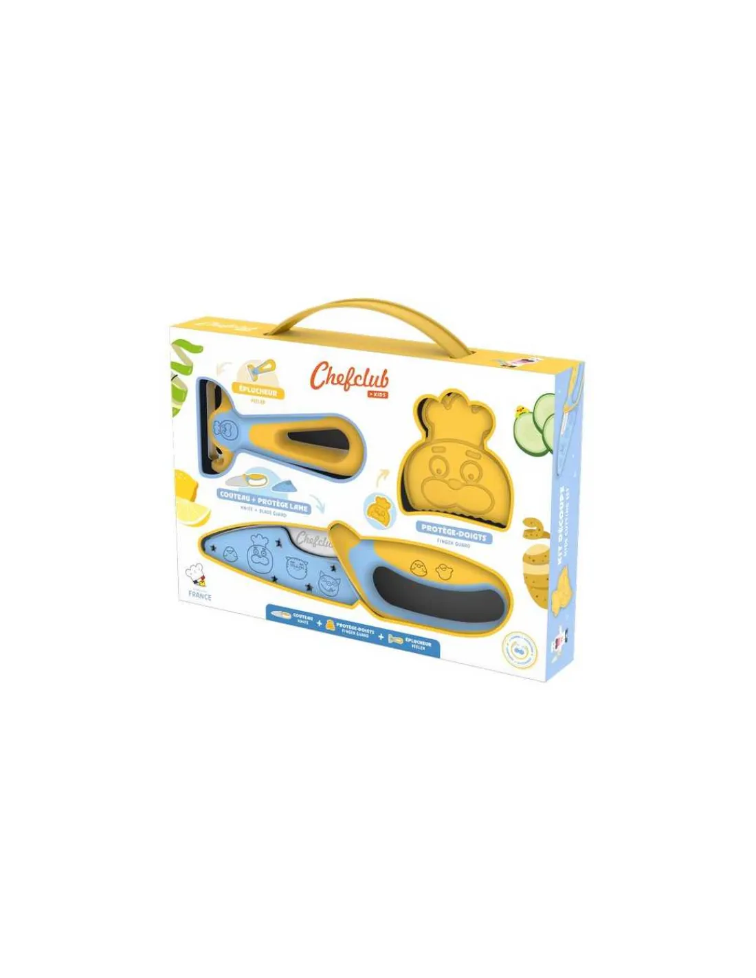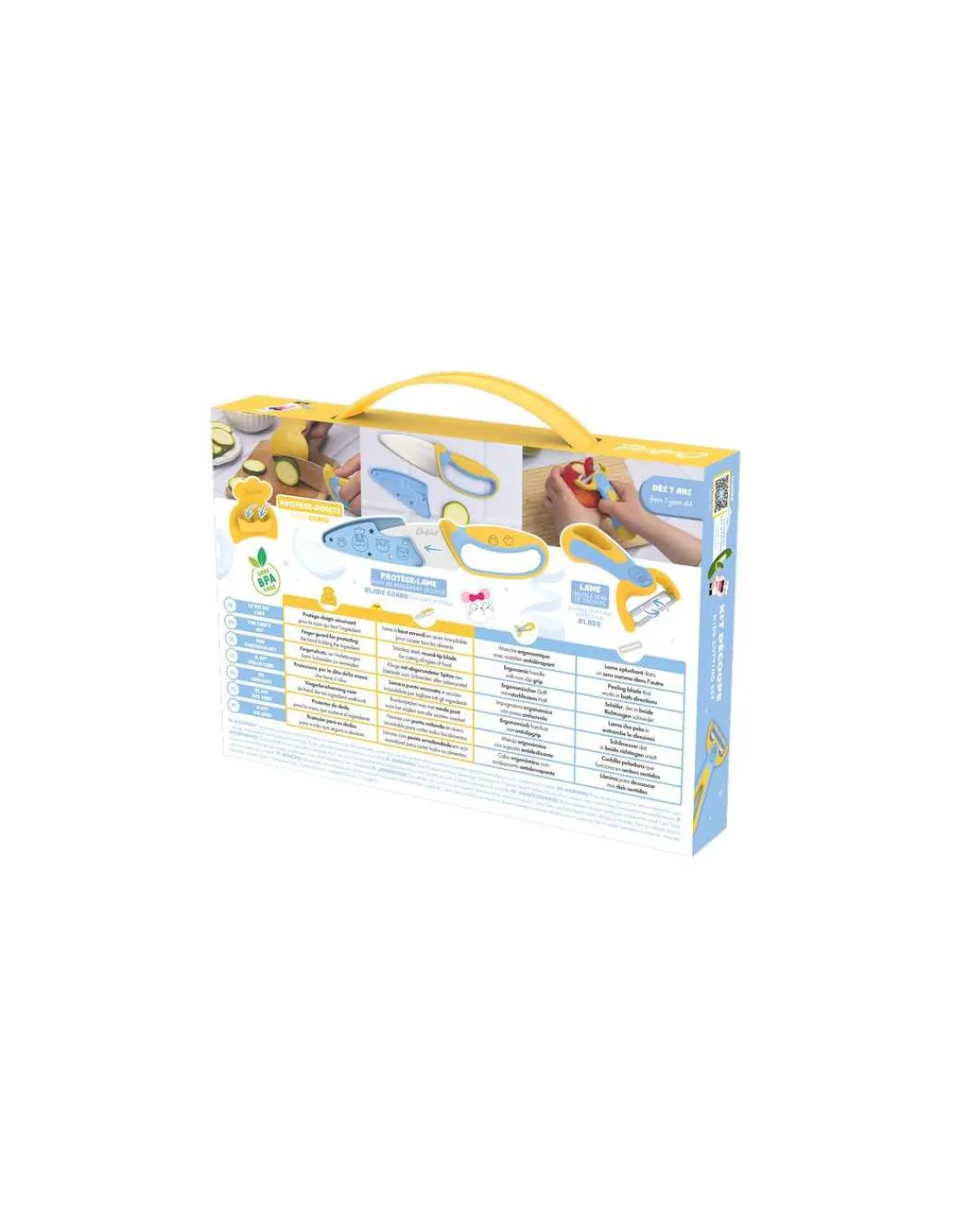Le coffret comprent 1 couteau de cuisine innovant et adapté aux petits cuistots, 1 protège-doigts pour sécuriser la main sur l’aliment, 1 protège-lame pour tout ranger sans se couper et 1 éplucheur adapté aux petites mains.