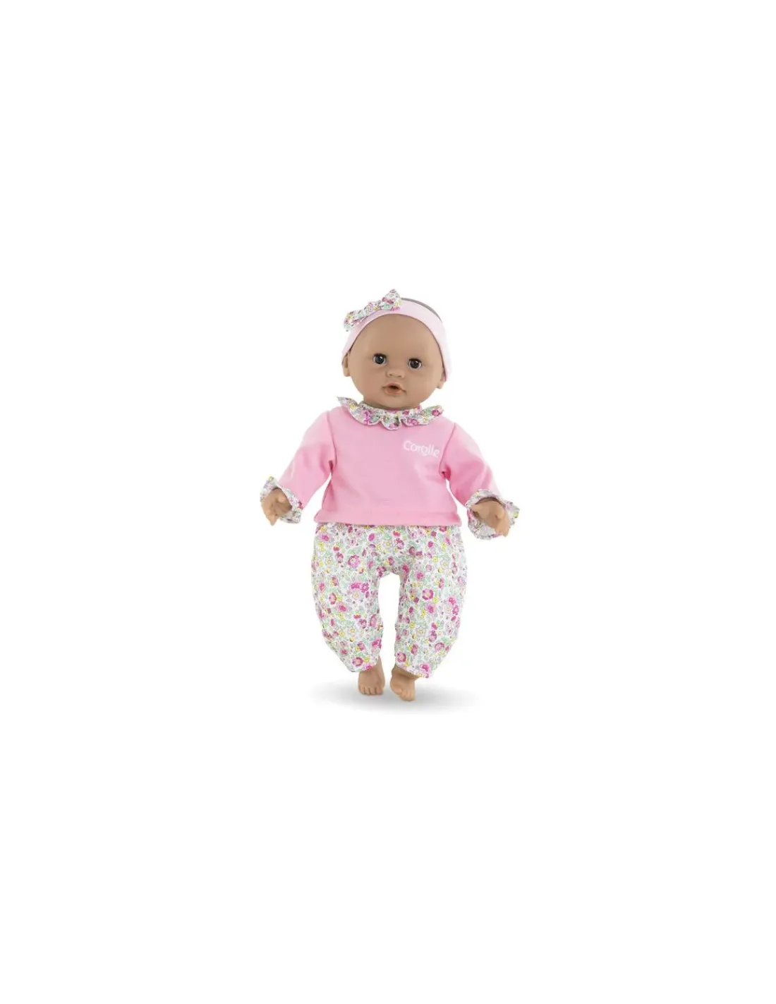 Tout mignon, ce poupon est habillé d’une tenue 2-en-1 composée d’un pantalon fleuri et d’un T-Shirt rose manches longues et coiffé d’un bandeau assorti.