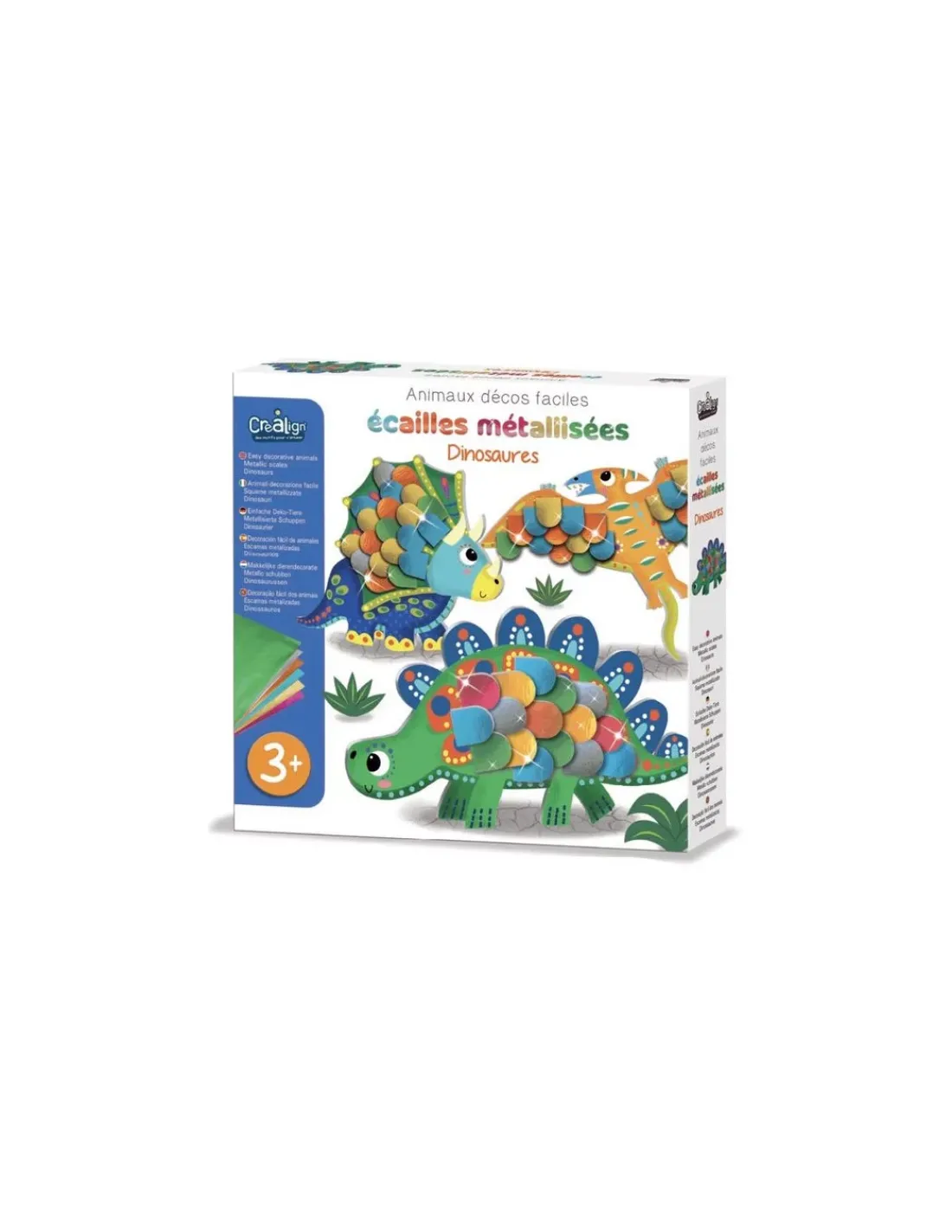 Découvrez le coffret Animaux décos faciles Ecailles métallisées dinosaures de Créalign’, une activité créative pour les enfants à partir de 3 ans sur le thème des dinosaures.