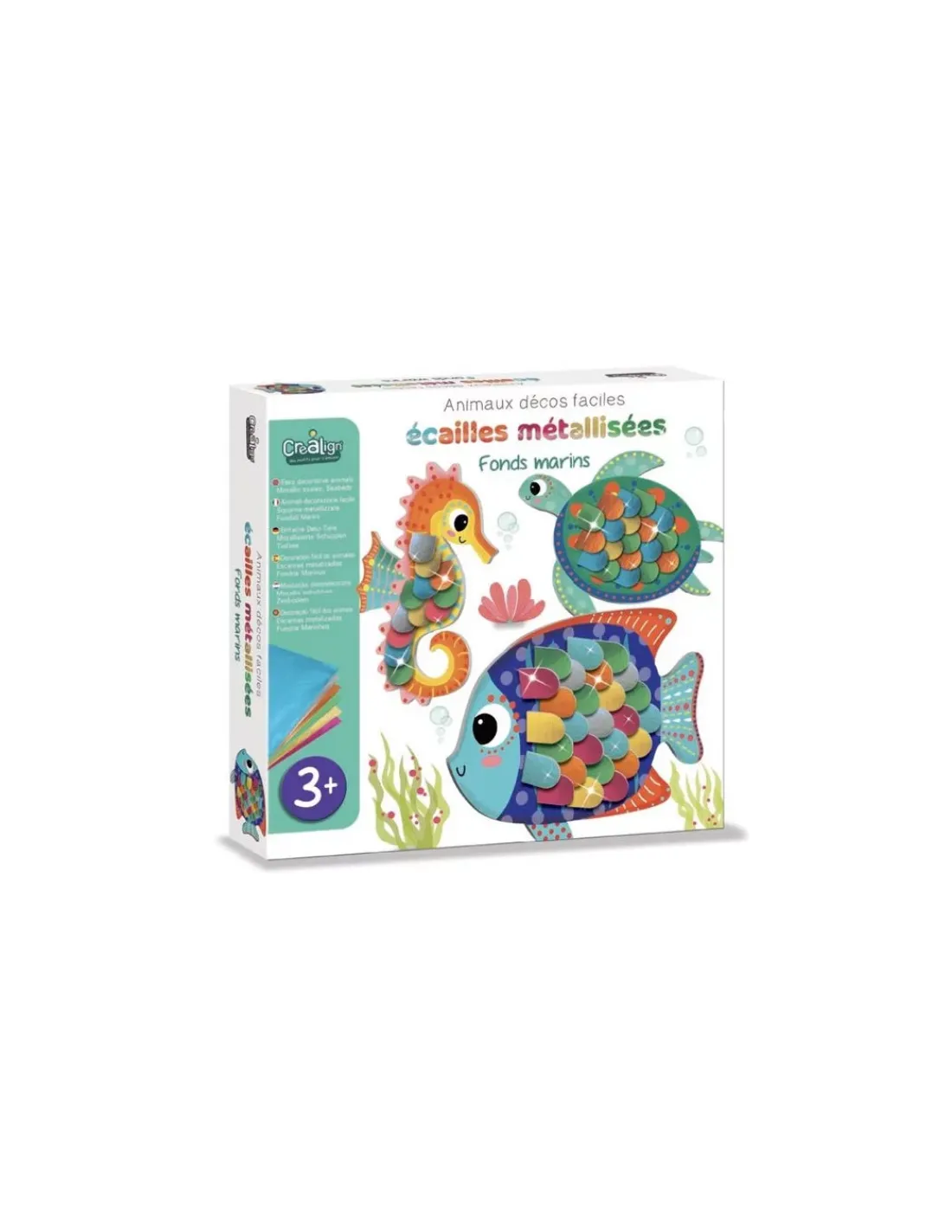 Découvrez le coffret Animaux décos faciles Ecailles métallisées Fonds marins de Créalign’, une activité créative pour les enfants à partir de 3 ans sur le thème des animaux marins avec un poisson, un hippocampe et une tortue.