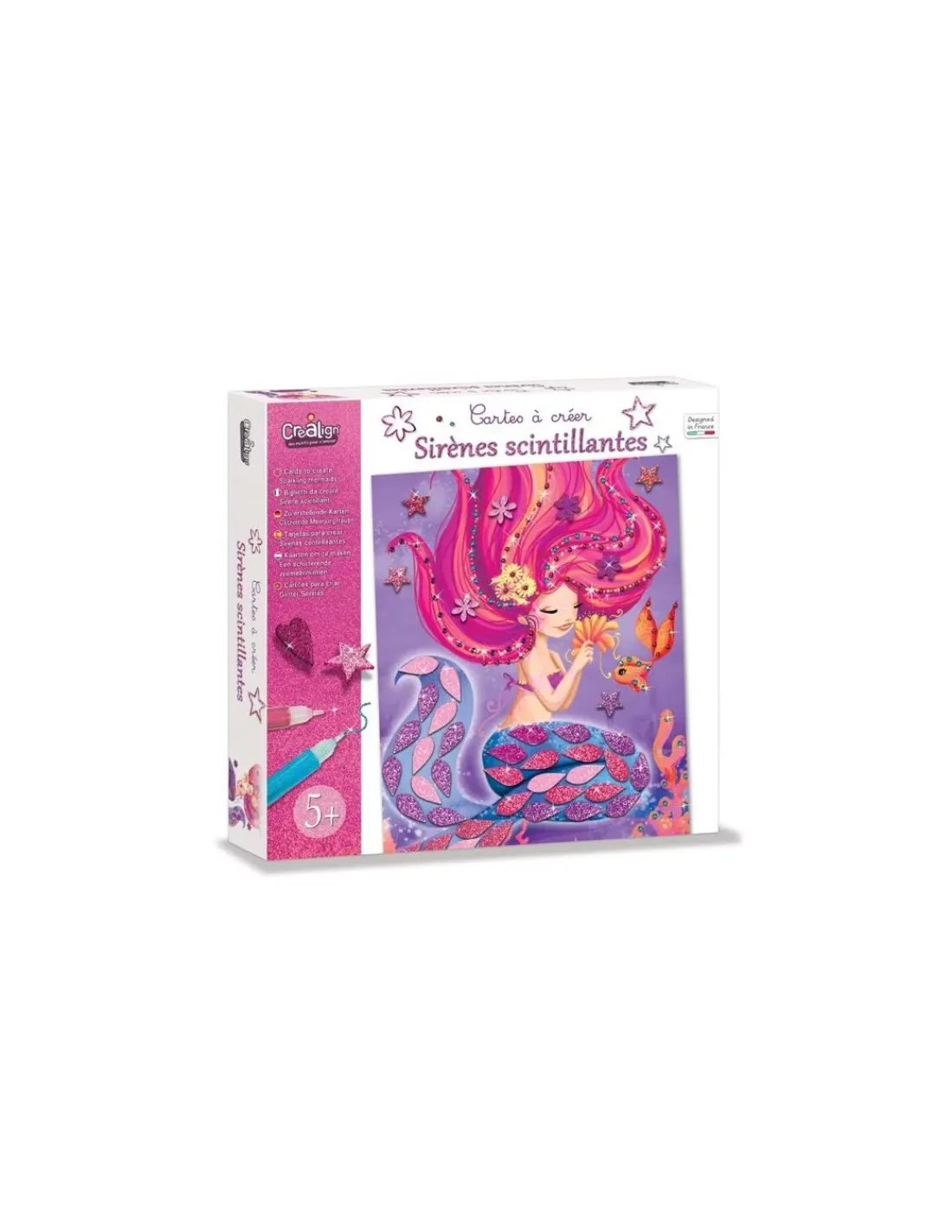 Découvrez le coffret Cartes à créer Sirènes scintillantes de Créalign’, une activité créative pour les enfants à partir de 5 ans mêlant assemblage et collage sur le thème des sirènes.