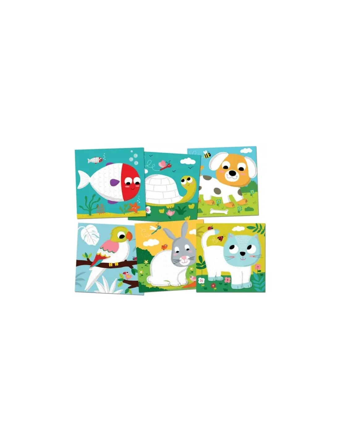 Les jeunes artistes ne déborderont pas des zones à remplir grâce aux masques intégrés. Chat, lapin, oiseau, chien, tortue et poisson se pareront de jolies empreintes de doigts colorées.