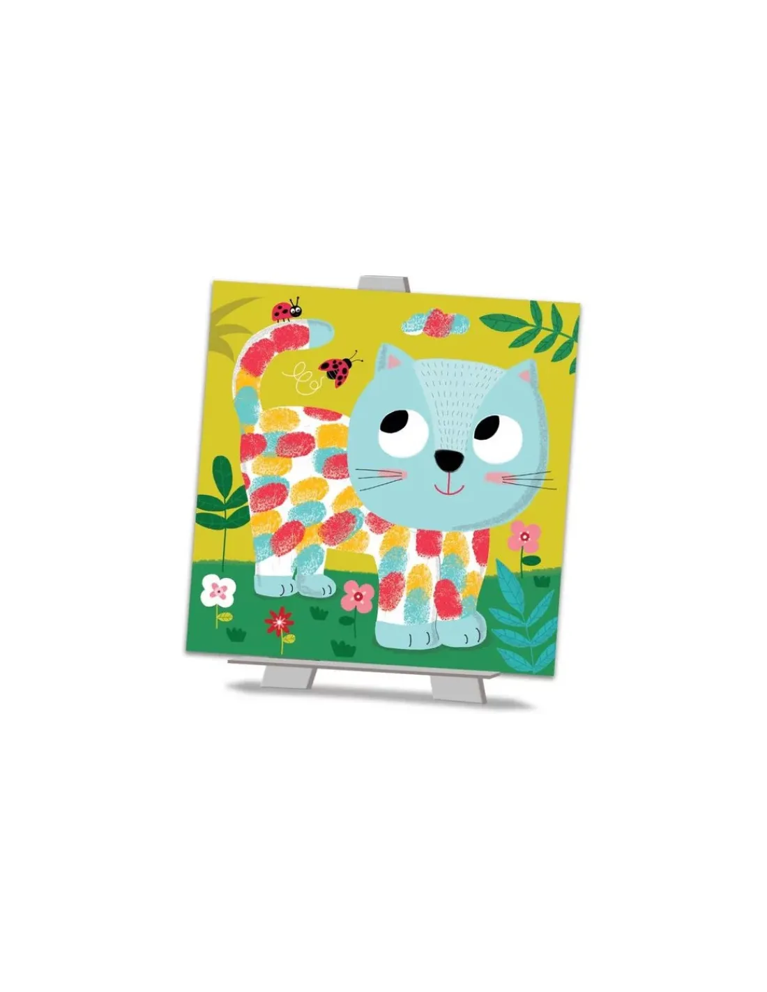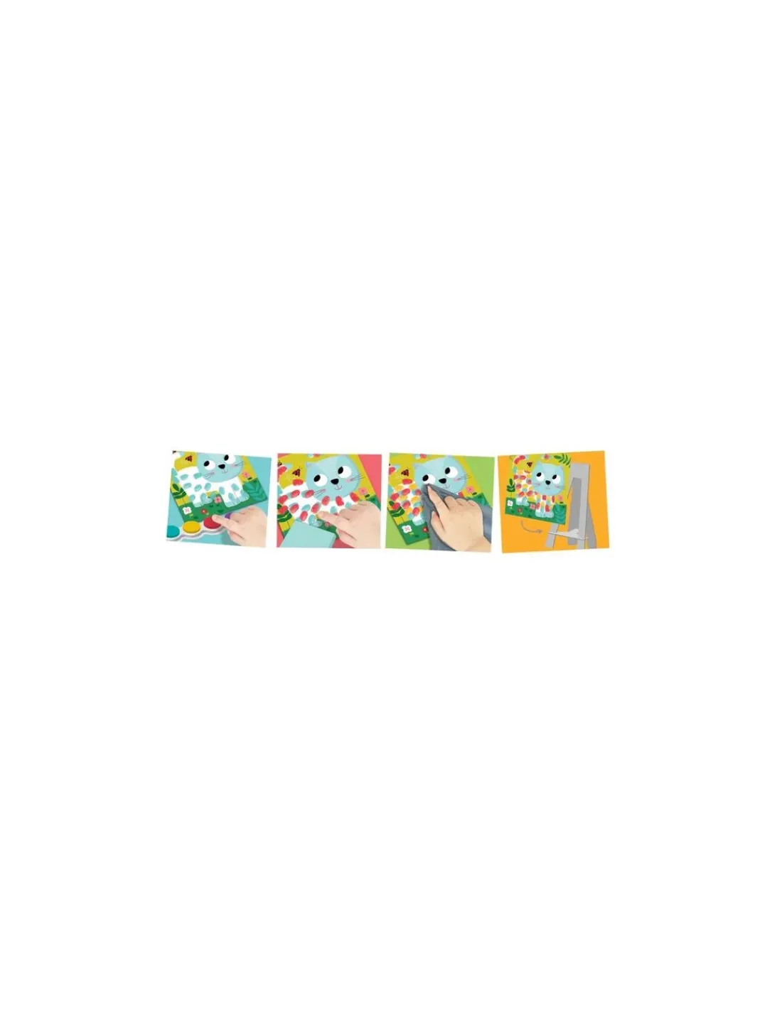 Ce coffret contient 6 cartes, 4 encreurs de peinture à doigt, un chevalet et une éponge essuie doigt.