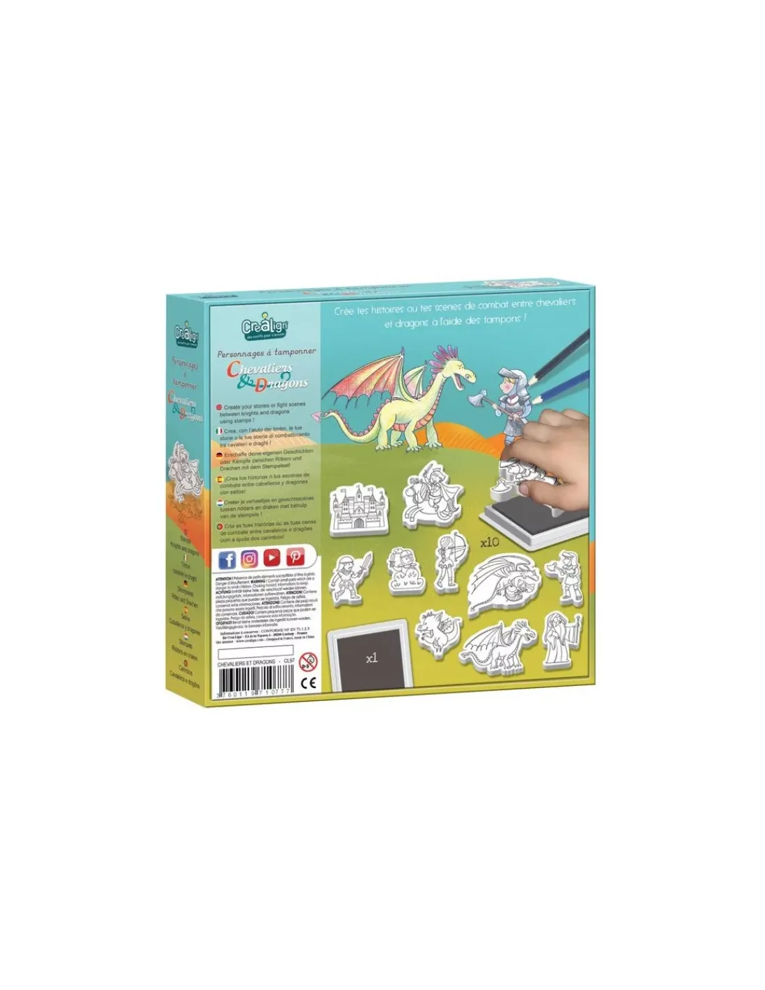 Découvrez le coffret Personnages à tamponner Chevaliers et Dragons de Créalign’, un coffret créatif de 10 tampons en mousse sur le thème des chevaliers pour les enfants à partir de 4 ans.