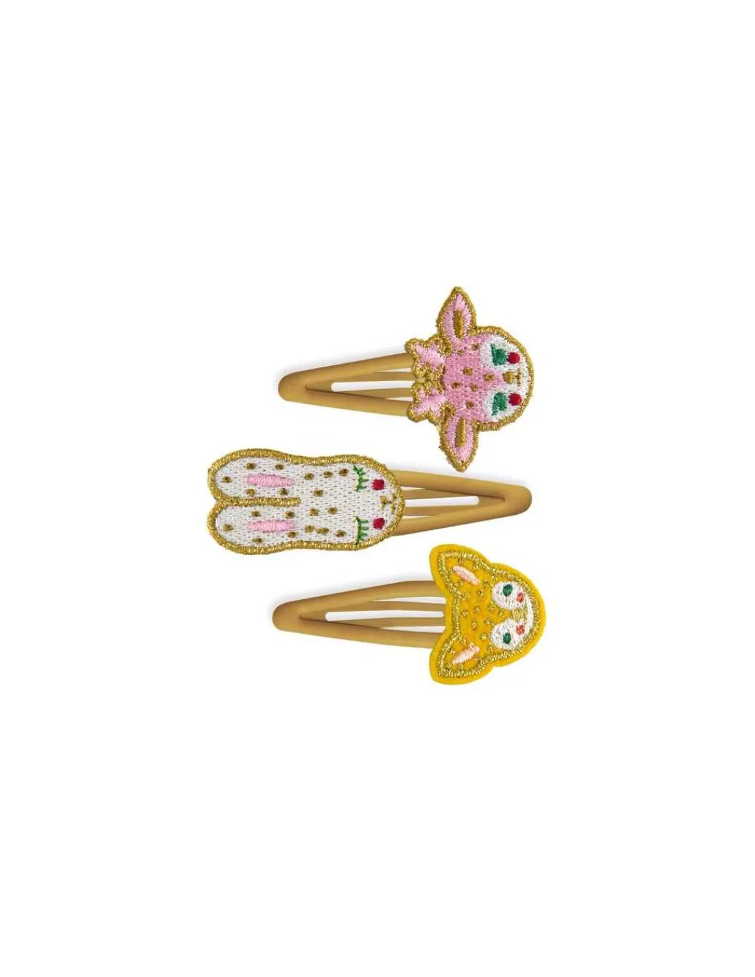 Le set comprend 3 barrettes-clip en métal avec 3 éléments différents : biche, lapin et renard en tissu brodé.
