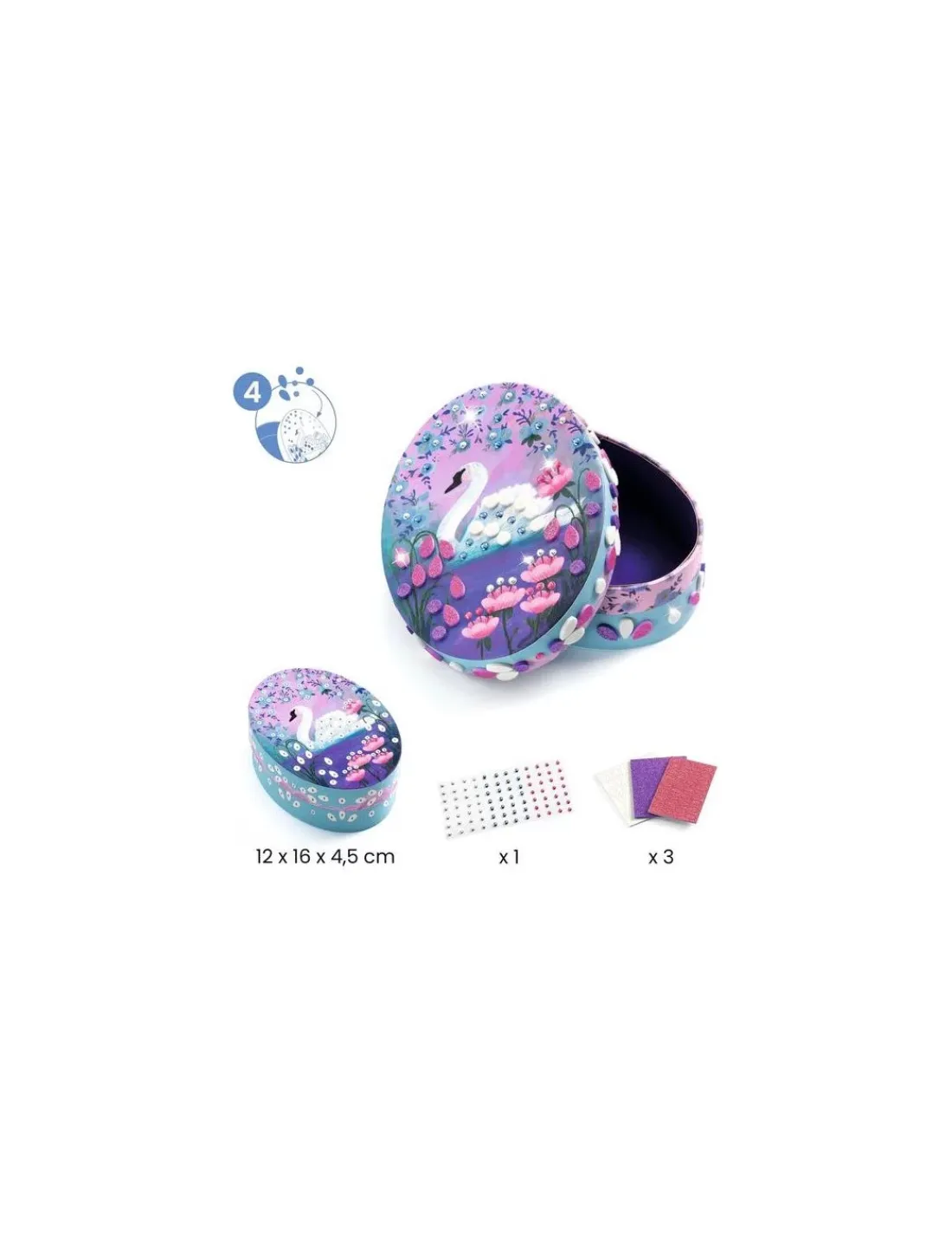 Vous trouverez tout le matériel nécessaire pour faire 12 créations ludiques: 2 diadèmes à décorer à l’aide de pierres précieuses autocollantes et d’autocollants en mousse pailletée, 2 baguettes magiques à créer avec des décalcomanies, stickers et rubans, 2 parures de bijoux à créer en enfilant les élastiques suivant la numérotation indiquée au dos des pièces, 1 boîte à bijoux à décorer à l’aide de stickers pierres précieuses et de mousses pailletées et dans laquelle votre enfant pourra ranger les 6 bijoux papier réalisés et 1 joli miroir à enrichir, couche après couche, de décorations papier qui lui apporteront un joli volume.
