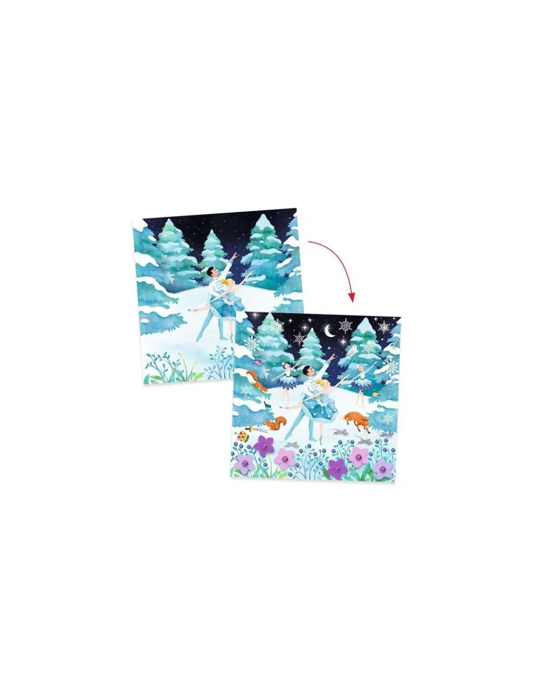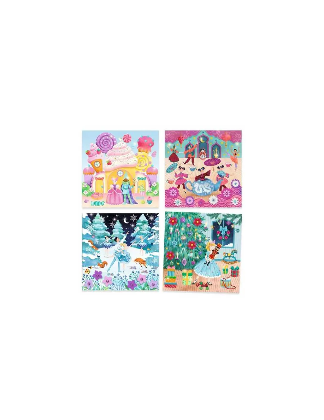 Les 4 illustrations de ce coffret reprennent 4 tableaux phare du célèbre ballet : la veillée de Noël, la Valse des Flocons, les danses du Monde et le pas de deux au Palais de la Fée Dragée.
