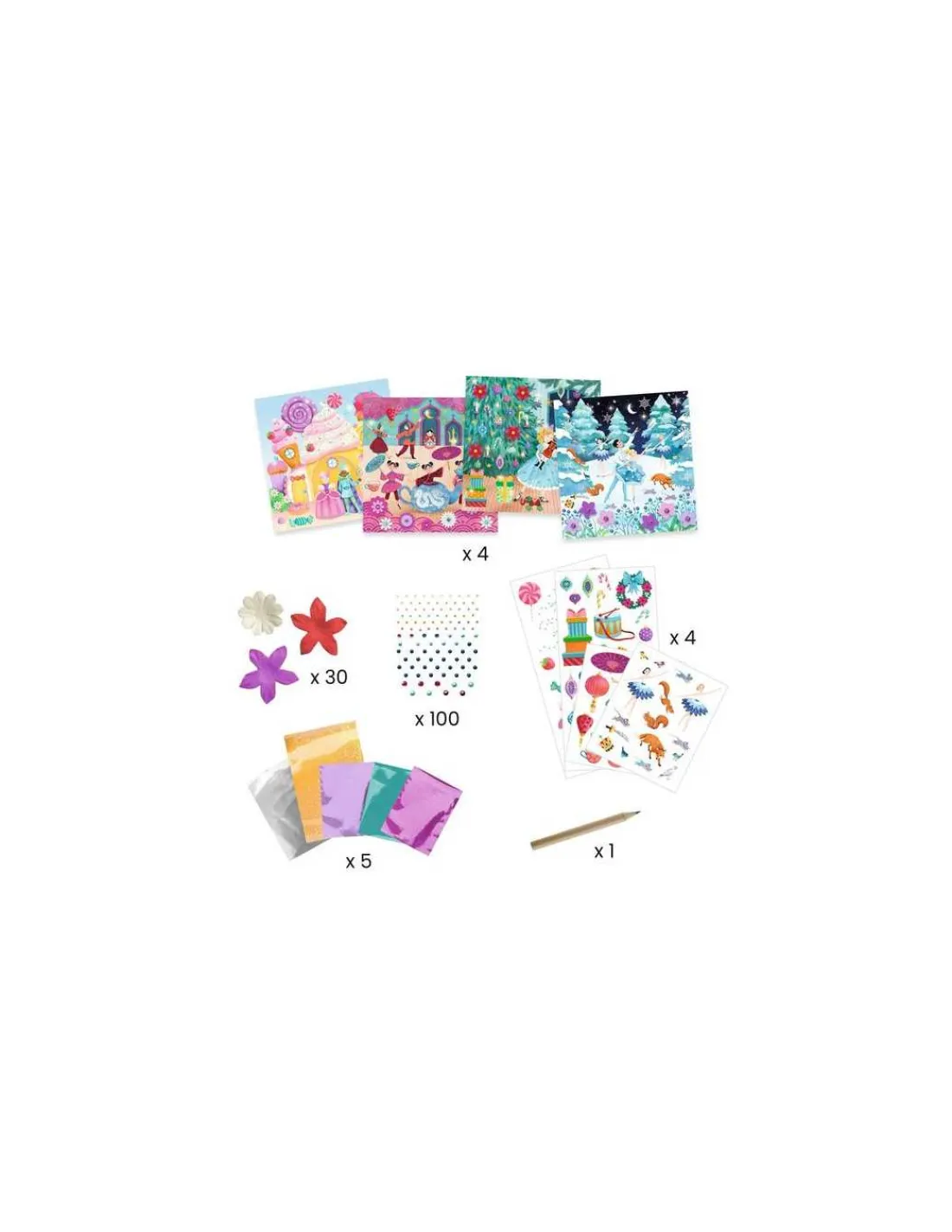 Ce coffret contient 4 tableaux, des décalcomanies, des fleurs en papier, 100 strass autocollants et des motifs à métalliser.