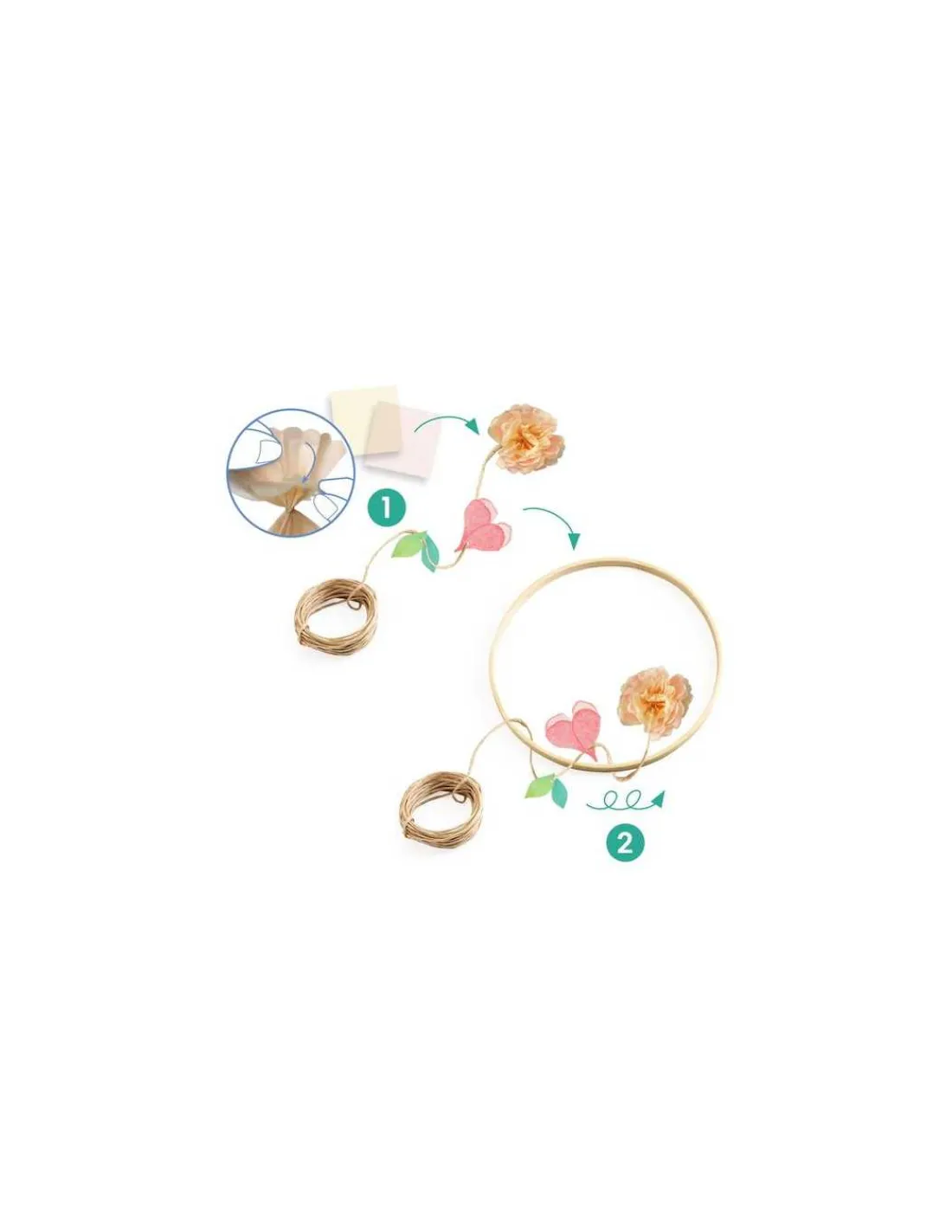 Votre enfant va pouvoir explorer la technique de création de fleurs en papier de soie, qu’il assemblera ensuite avec d’autres éléments finement illustrés pour composer une couronne éblouissante. L’anneau en bambou et le fil de raphia, identiques à ceux utilisés par les fleuristes professionnels, confèrent un aspect naturel et authentique à la réalisation finale.