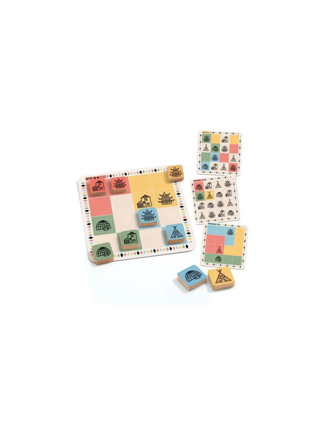 Sur le principe du sudoku, placer les 16 jetons en bois sur les grilles selon les contraintes indiquées. Réflexion et logique seront nécessaires.