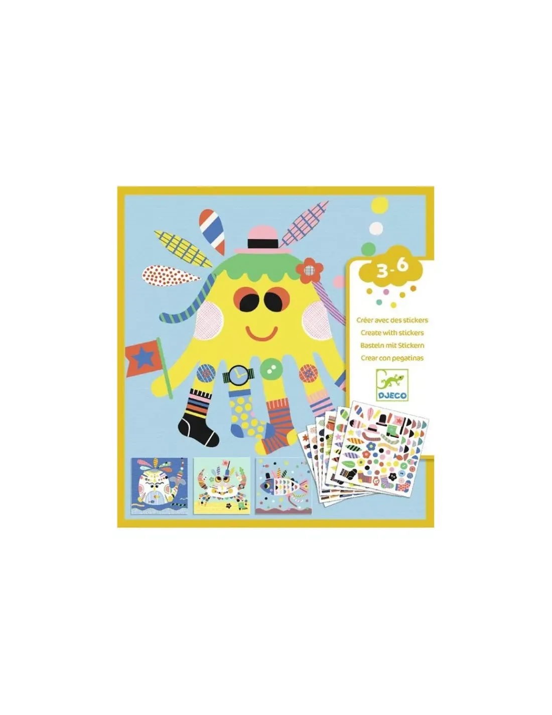 Une pochette de collage pour s’amuser à habiller des animaux marins avec de nombreux stickers colorés tous plus fantaisistes les uns que les autres.