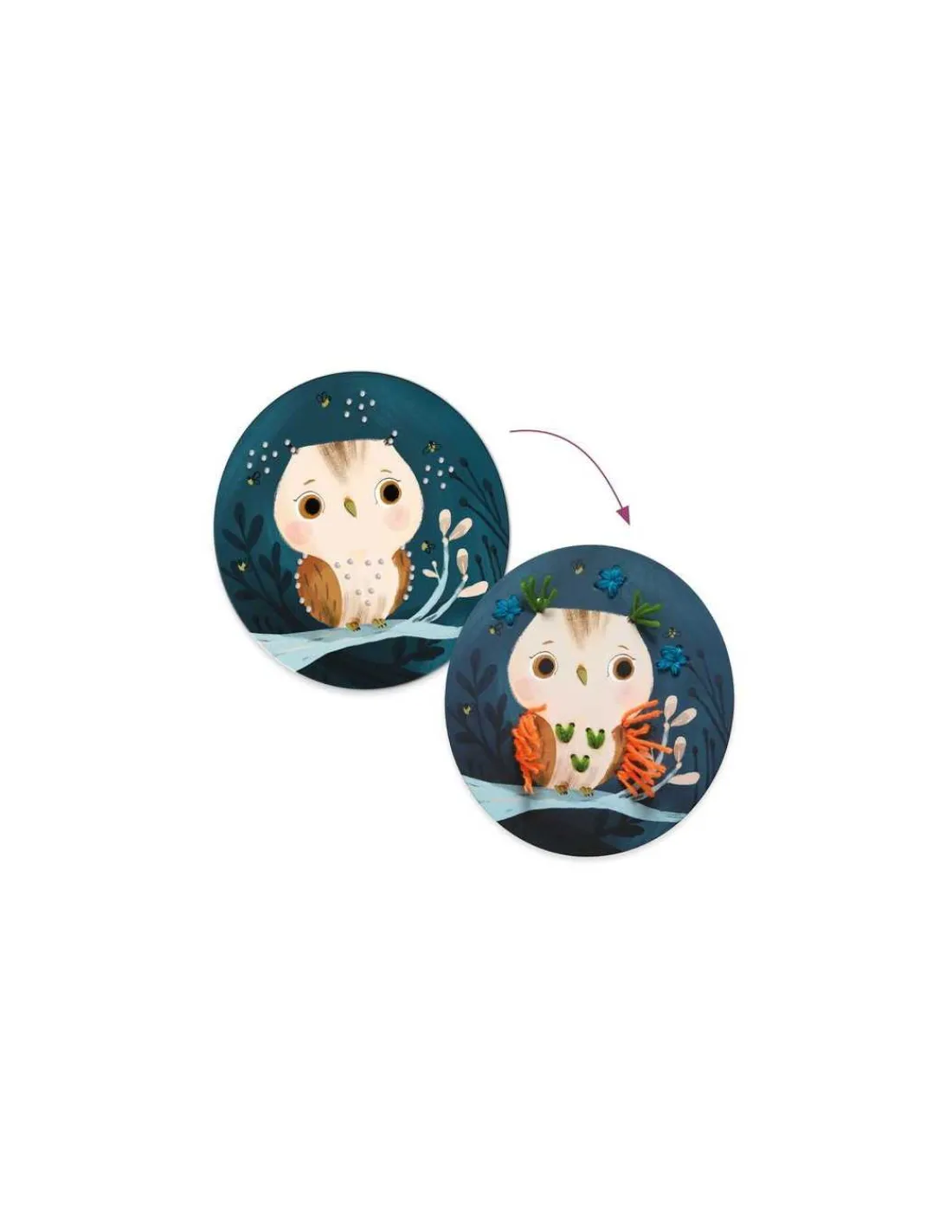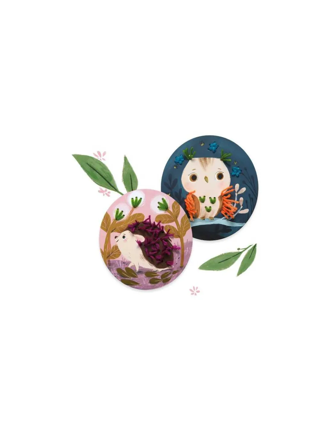 Ce coffret comprend 4 cercles en carton épais illustrés et percés, 20 brins de 50 cm de laine, 1 aiguille, 1 paire de ciseaux et 1 livret explicatif.