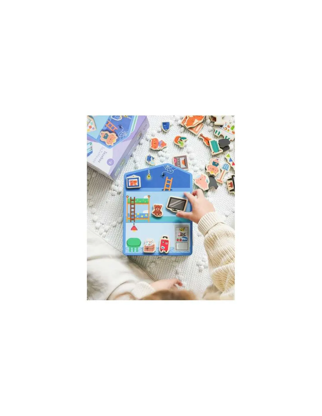 Une boite en forme de maison renfermant 40 magnets en bois en forme d’objets et de personnages, que l’enfant positionne sur les deux faces de la boîte représentant les pièces de la maison : le grenier, la chambre, la cuisine, le salon, la salle de bain et la salle de jeux.