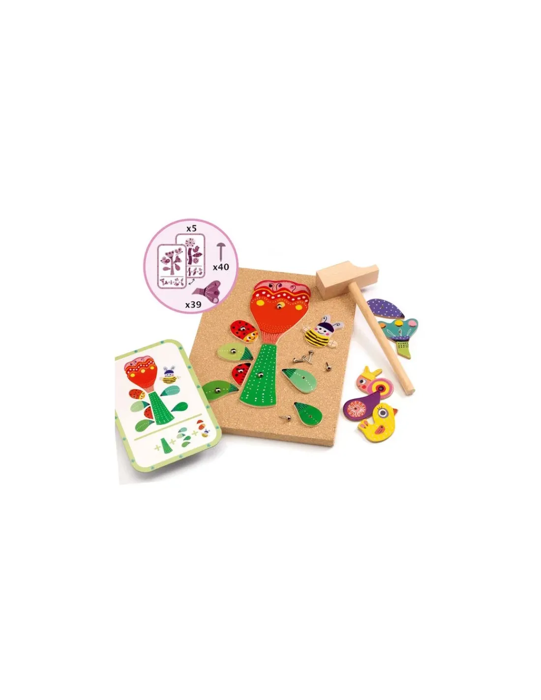 La boite contient 39 pièces en bois illustrées et trouées, 40 clous, 1 planche de liège, 1 marteau en bois et 5 cartes modèle.