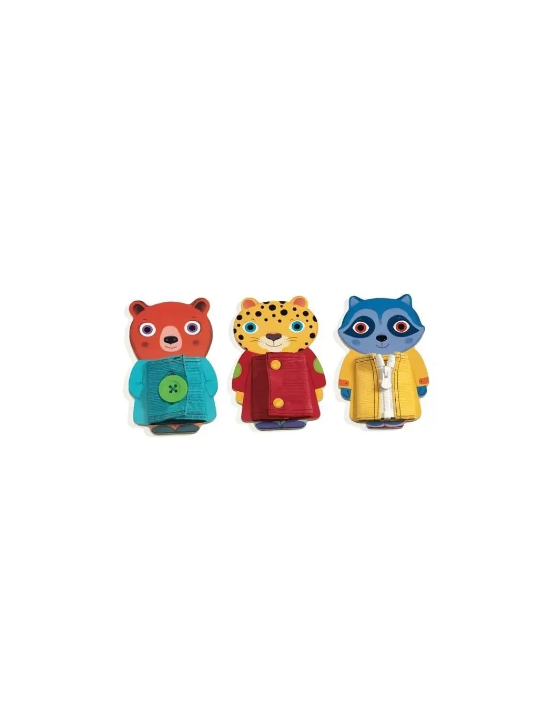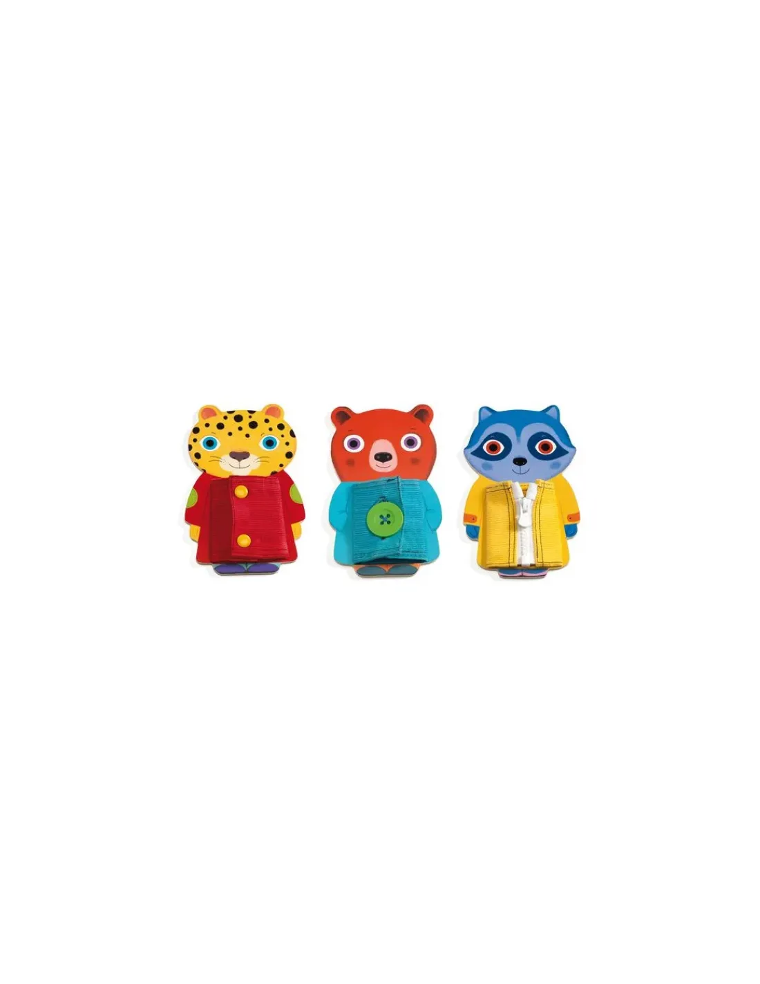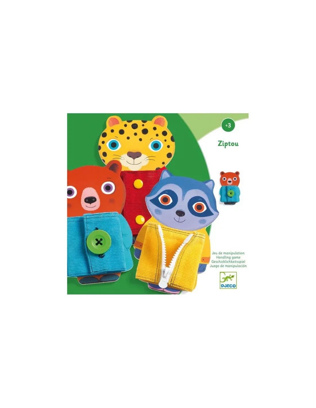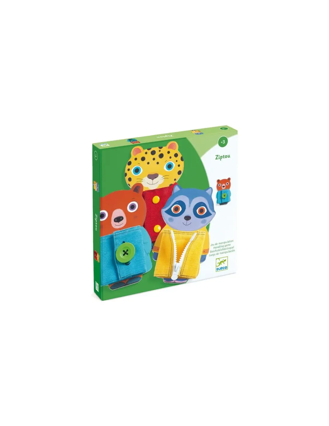 Découvrez le jeu de manipulation Ziptou de Djeco, un coffret avec 3 animaux en bois avec chacun un vêtement en tissu à fermer, un jeu pour les enfants à partir de 3 ans.