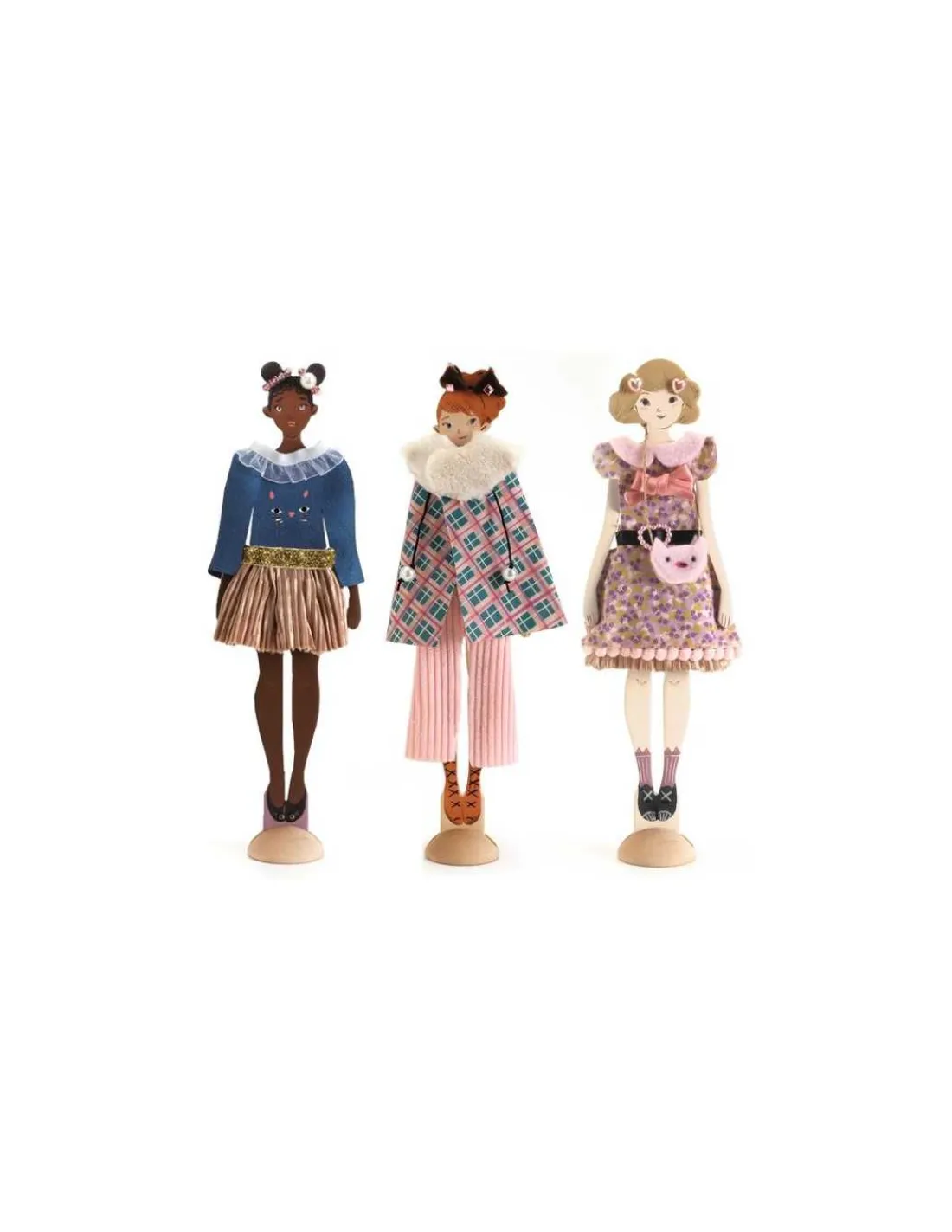 Le coffret contient 3 poupées, 3 socles en bois, 3 tissus imprimés, 5 tissus de matières variées, 5 galons ou rubans, 2 fils élastiques, un sachet de perles et petits accessoires, 1 planche de strass autocollants, 1 paire de ciseaux, 1 rouleau d’adhésif double-face, 1 stylo et 3 planches de patrons.