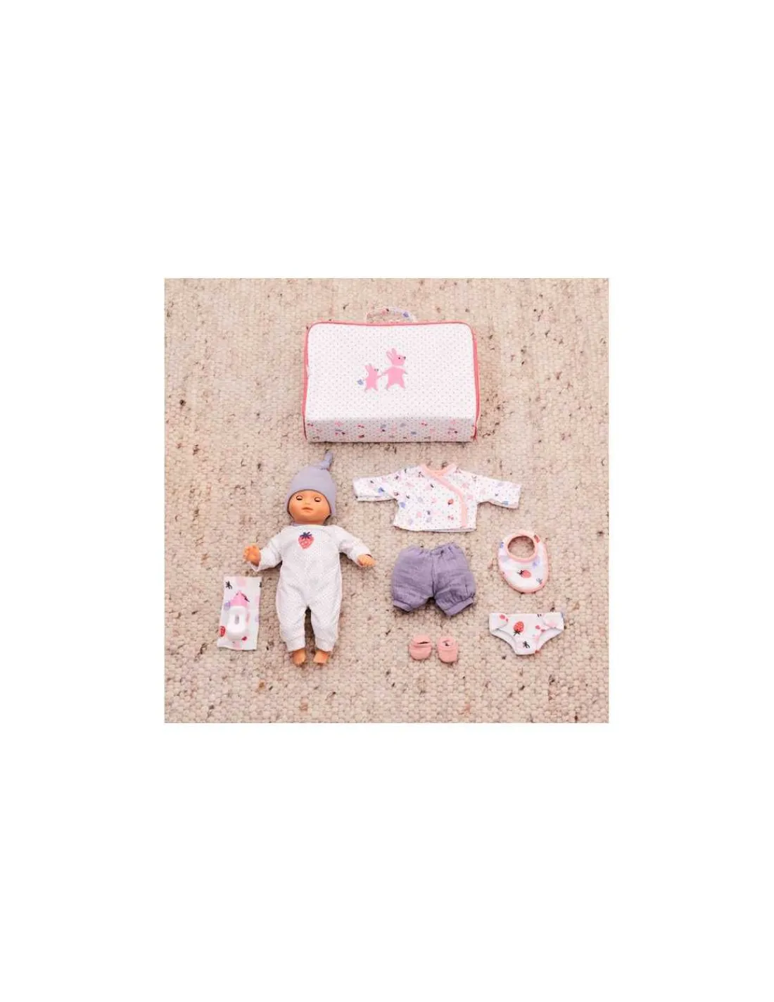 Le coffret contient 1 valise, 1 poupon de 32 cm (corps souple en tissu et tête, bras et jambes en vinyle), 1 pyjama, 1 bonnet, 1 haut cache-coeur, 1 bloomer, 1 paire de chaussons, 1 couche, 1 lingette, 1 biberon et 1 bavoir.