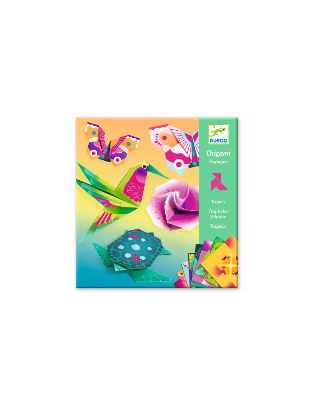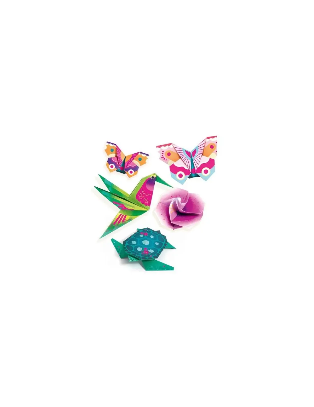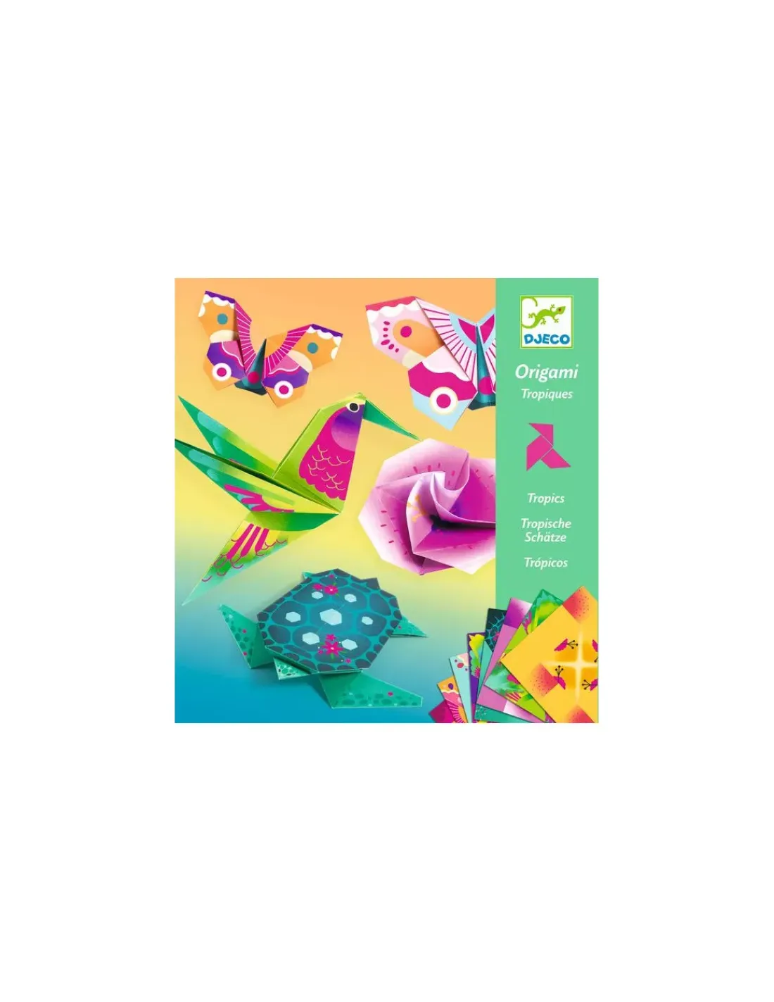 Découvrez la pochette origami tropiques de Djeco pour les enfants à partir de 6 ans, une activité de pliage pour réaliser 24 créations fluos représentant des animaux et des végétaux des tropiques avec un colibri, une fleur, une tortue ou encore un papillon.