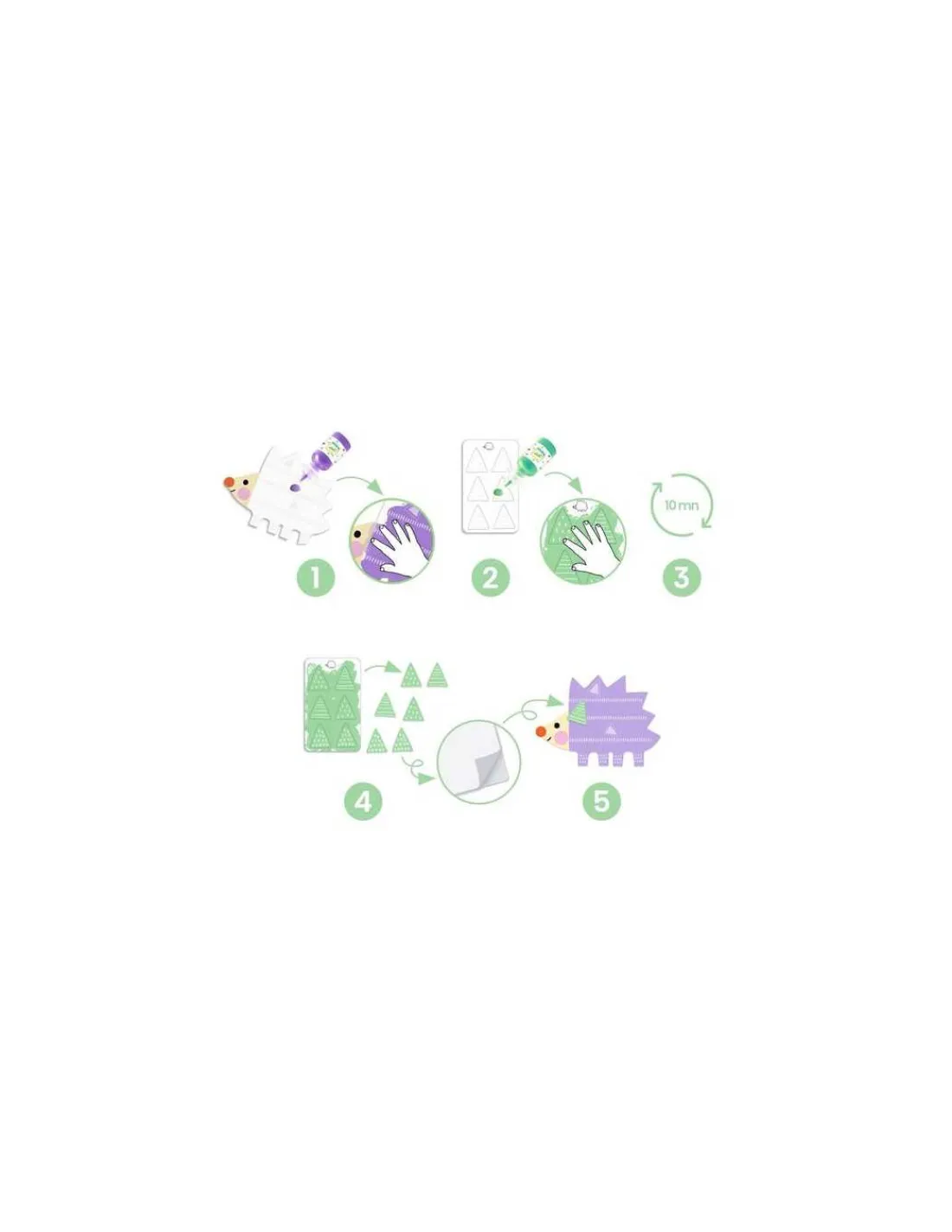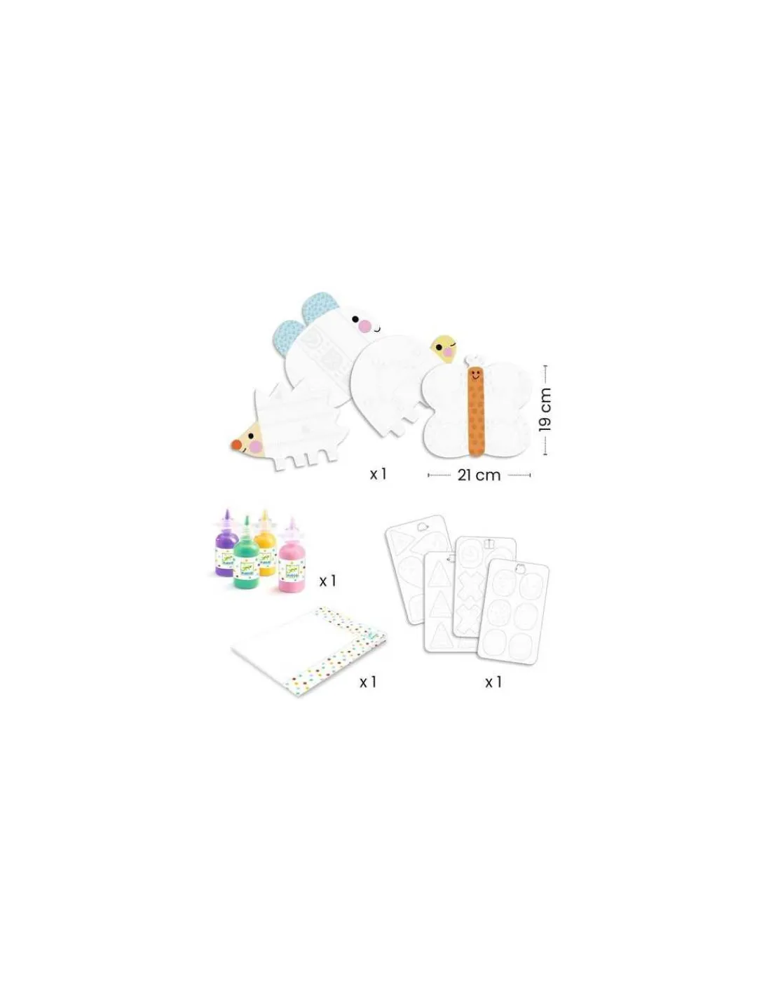 Ce coffret comprend 4 planches silhouettées à peindre, 4 planches de petites formes autocollantes à dépuncher et à peindre, 1 protection de table en papier et un livret explicatif visuel.