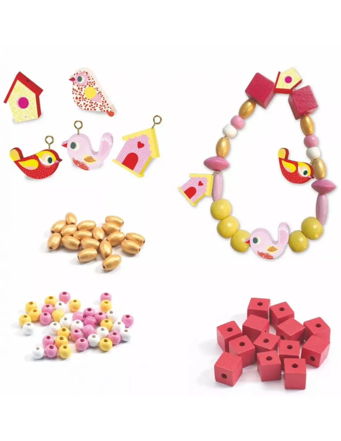 Ce coffret contient plus de 450 perles en bois dont des perles en forme d’oiseaux, de cabanes à oiseaux et 2 couleurs de fil.