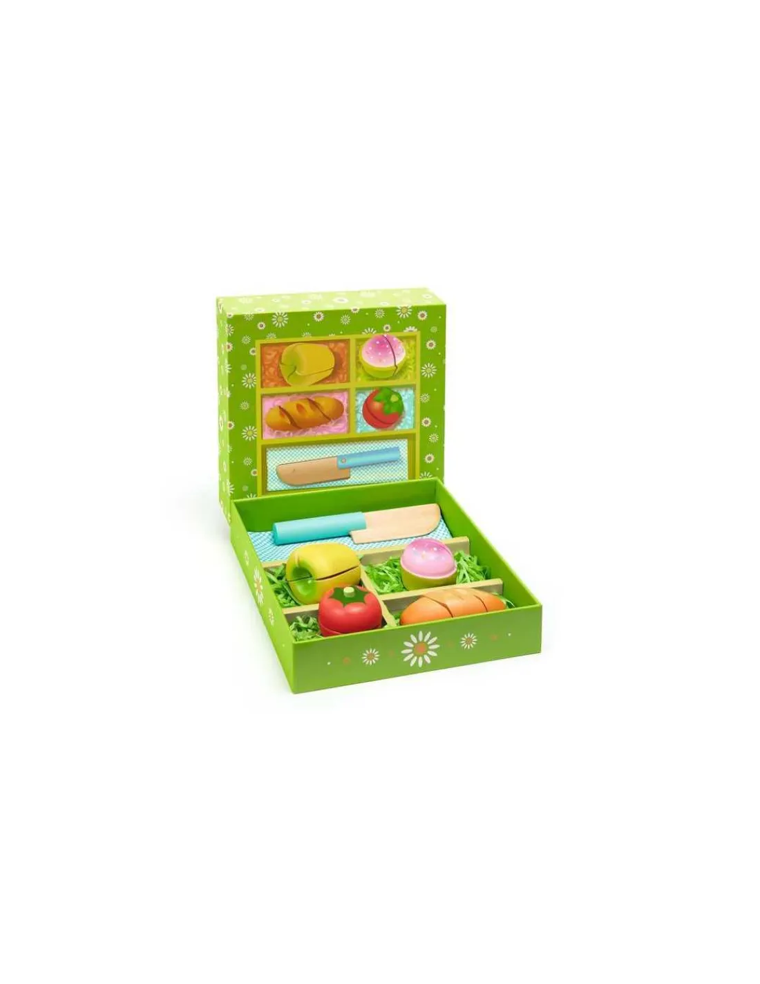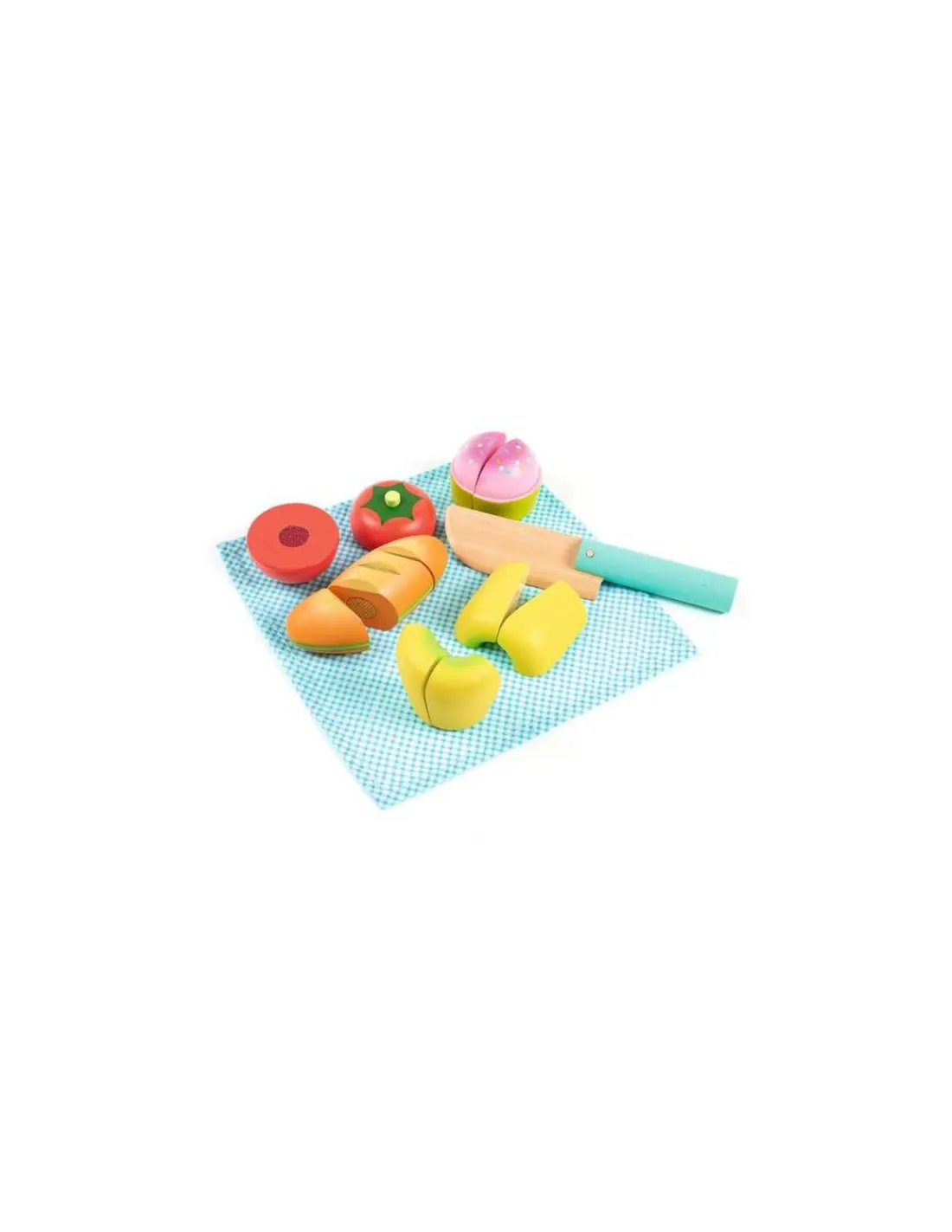 Un coffret coloré avec tout le nécessaire pour organiser un pique-nique à la campagne comme les grands. À l’aide de son couteau en bois, l’enfant partage son repas avec ses amis. Grâce au velcro sur chaque pièce, l’enfant a le plaisir de couper les éléments comme les grands : du pain, une tomate, un gâteau…