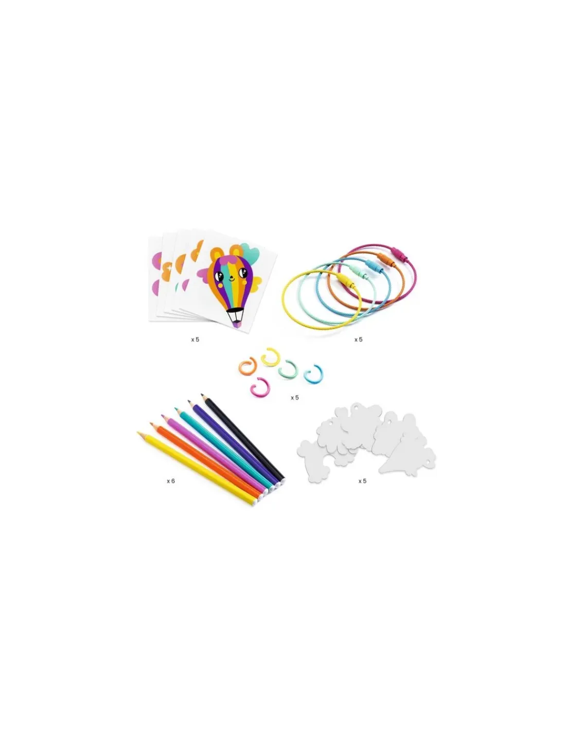 Le coffret contient 5 silhouettes de plastique magique transparent à colorier, 5 câbles métalliques à fermoir vis, 5 anneaux de liaison, 5 planches modèles, 6 mini crayons de couleurs, 1 feuillet d’explications pas à pas en couleurs.