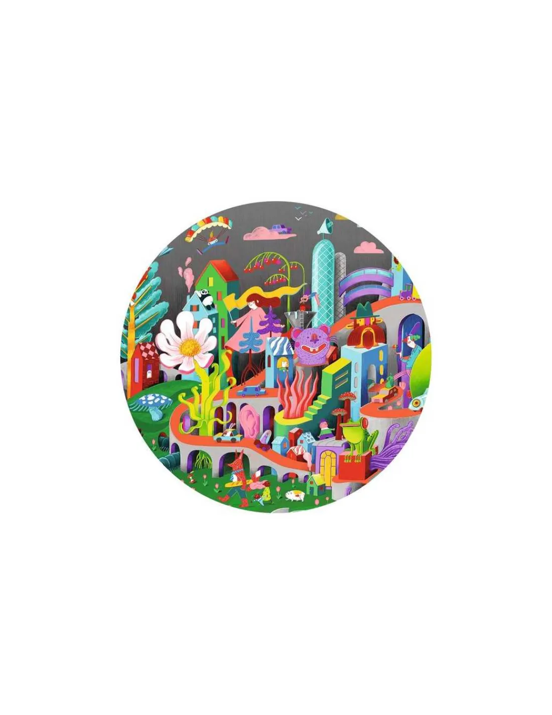 Un puzzle représentant une ville fantastique, où voltigent de drôles de personnages. Un bel univers à découvrir à travers une illustration riche en détails et en surprises.