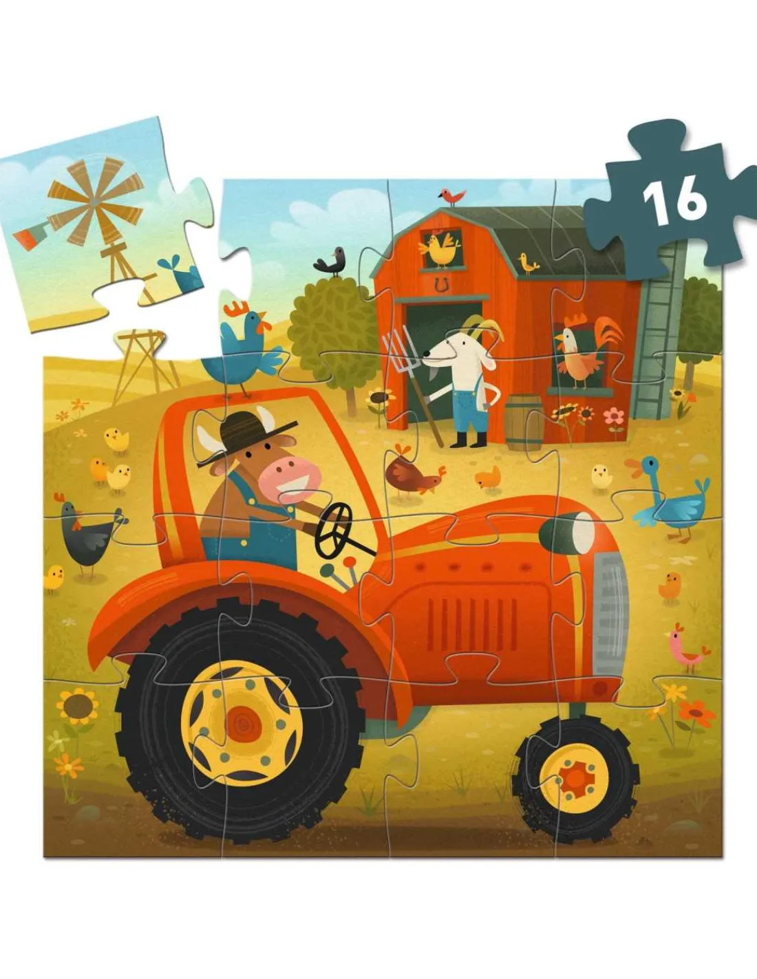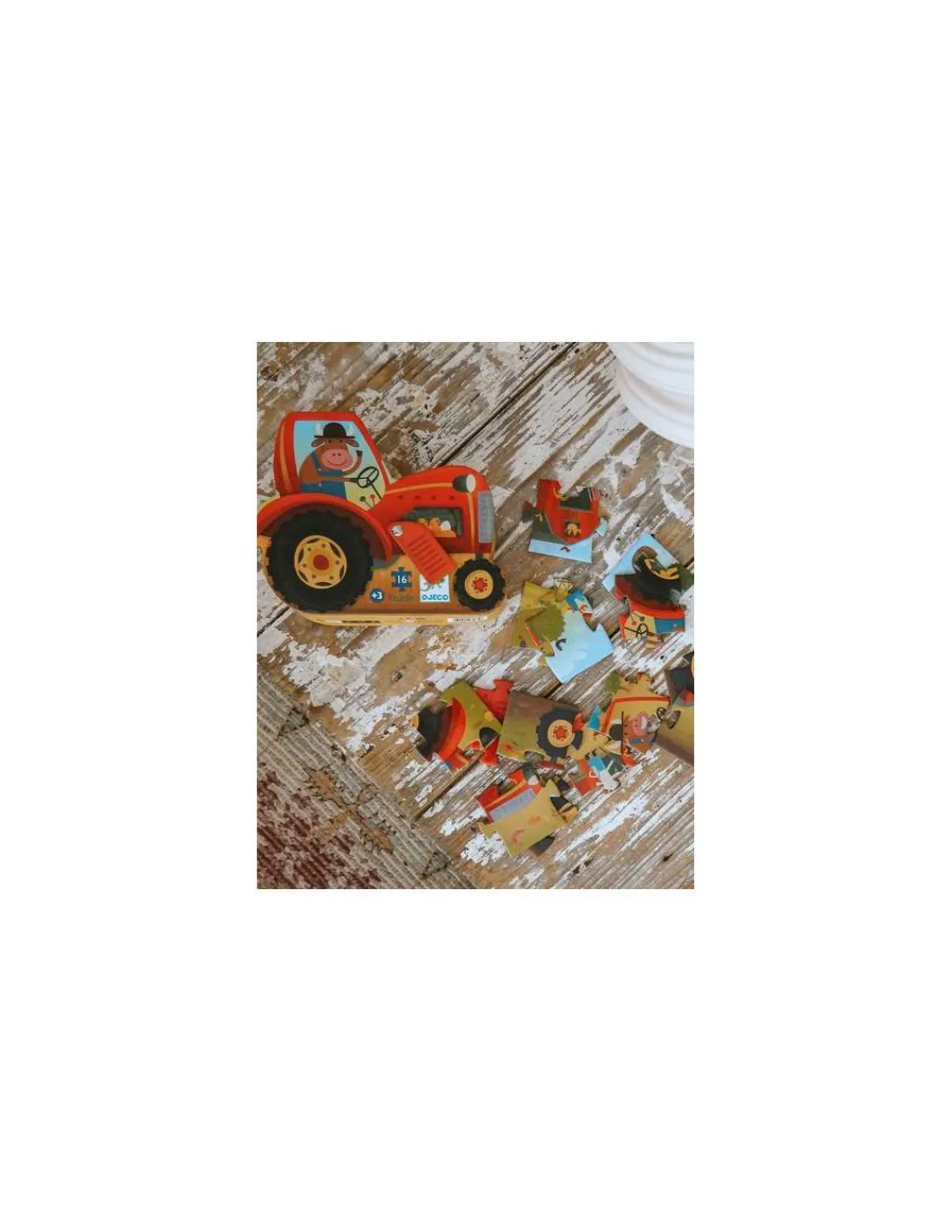 Découvrez le puzzle Tracteur de Djeco, un magnifique puzzle de 16 pièces pour les enfants dès 3 ans, présenté dans une boite silhouette tout en rondeur.