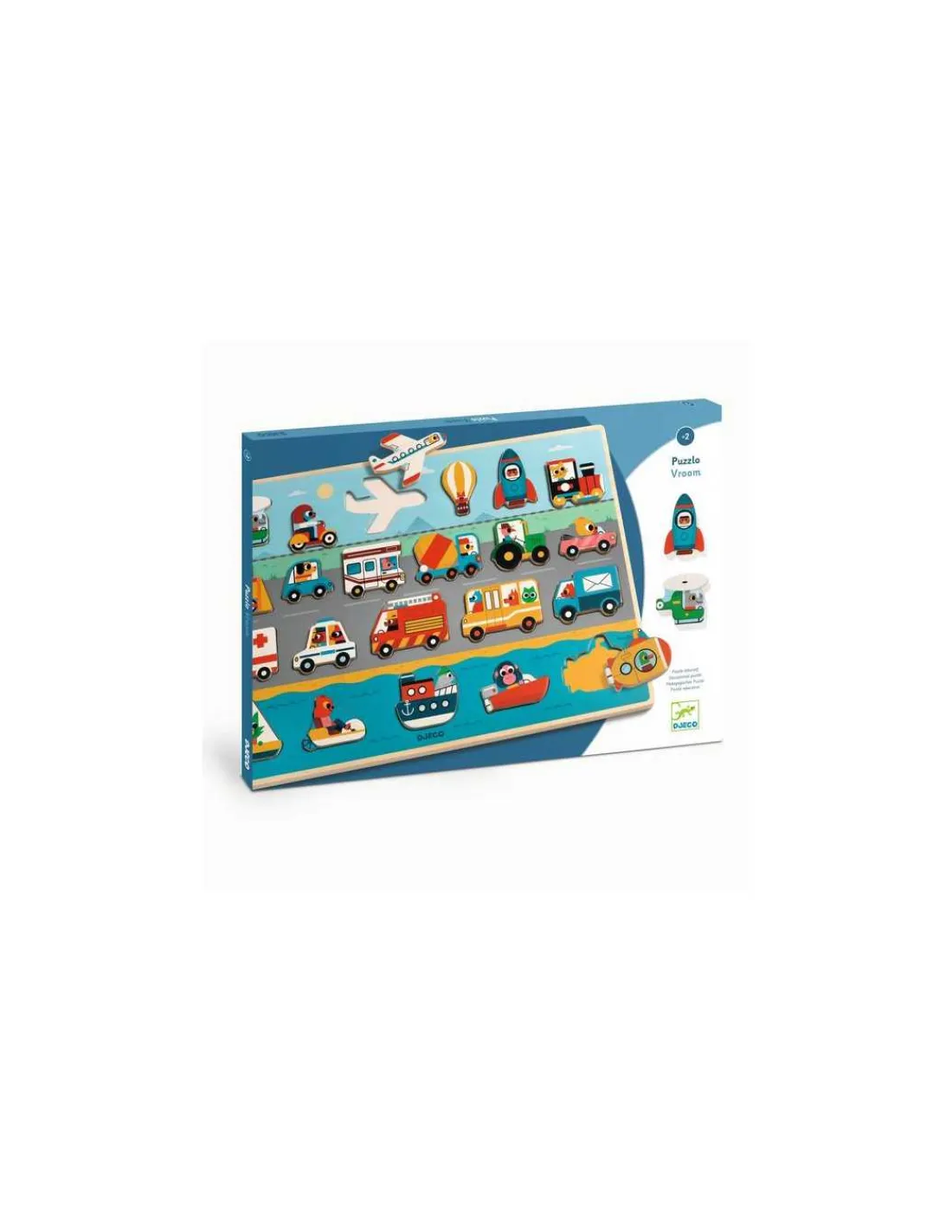 Découvrez le Puzzlo Vroom de Djeco, un superbe puzzle en bois de 22 pièces pour les enfants à partir de 2 ans. Un joli puzzle à encaster sur le thème des véhicules.