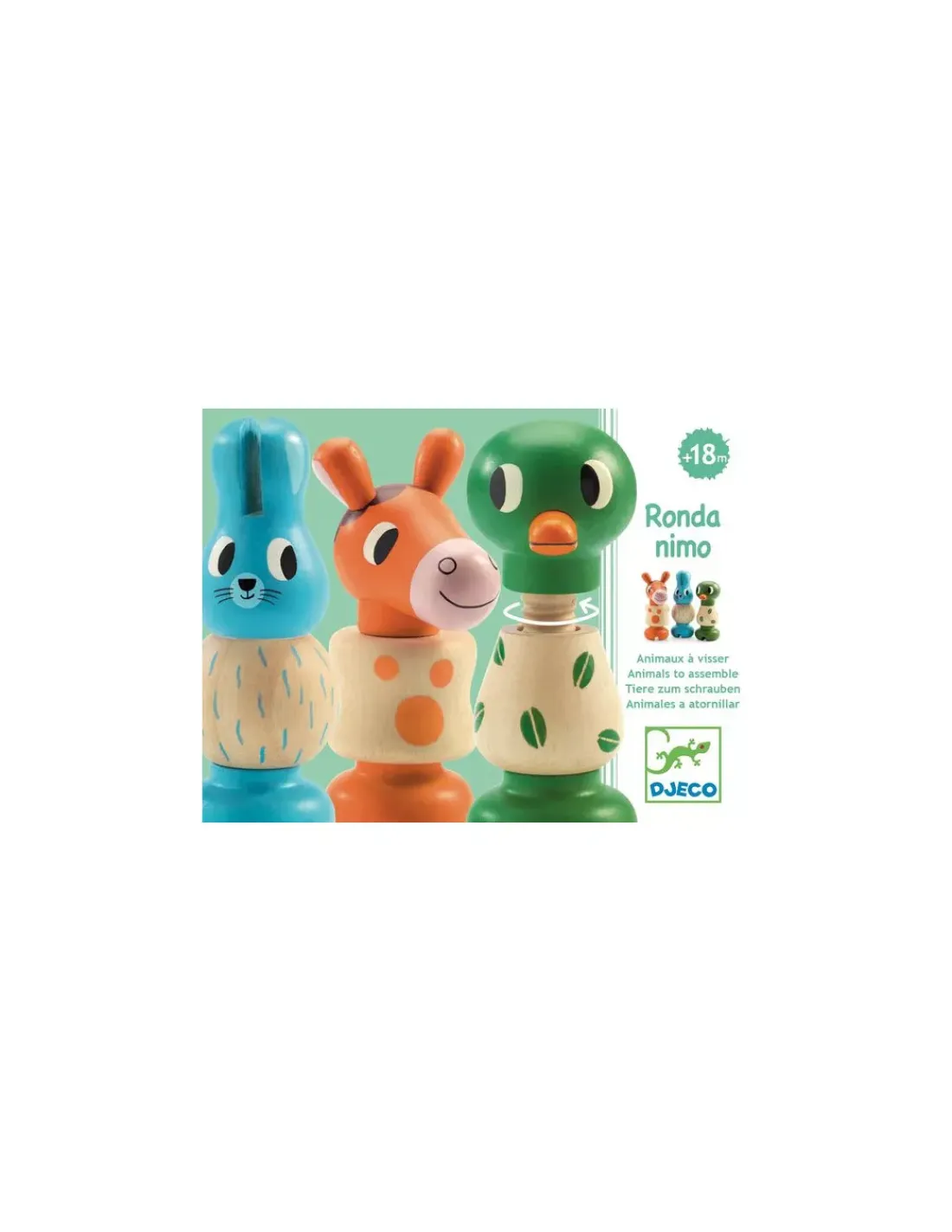 Découvrez Rondanimo de Djeco, un jeu de manipulation composé de 3 animaux en bois à visser pour développer la dextérité de bébé dès 18 mois.