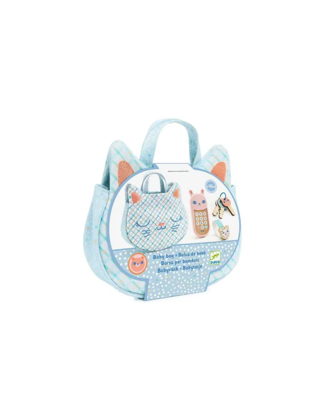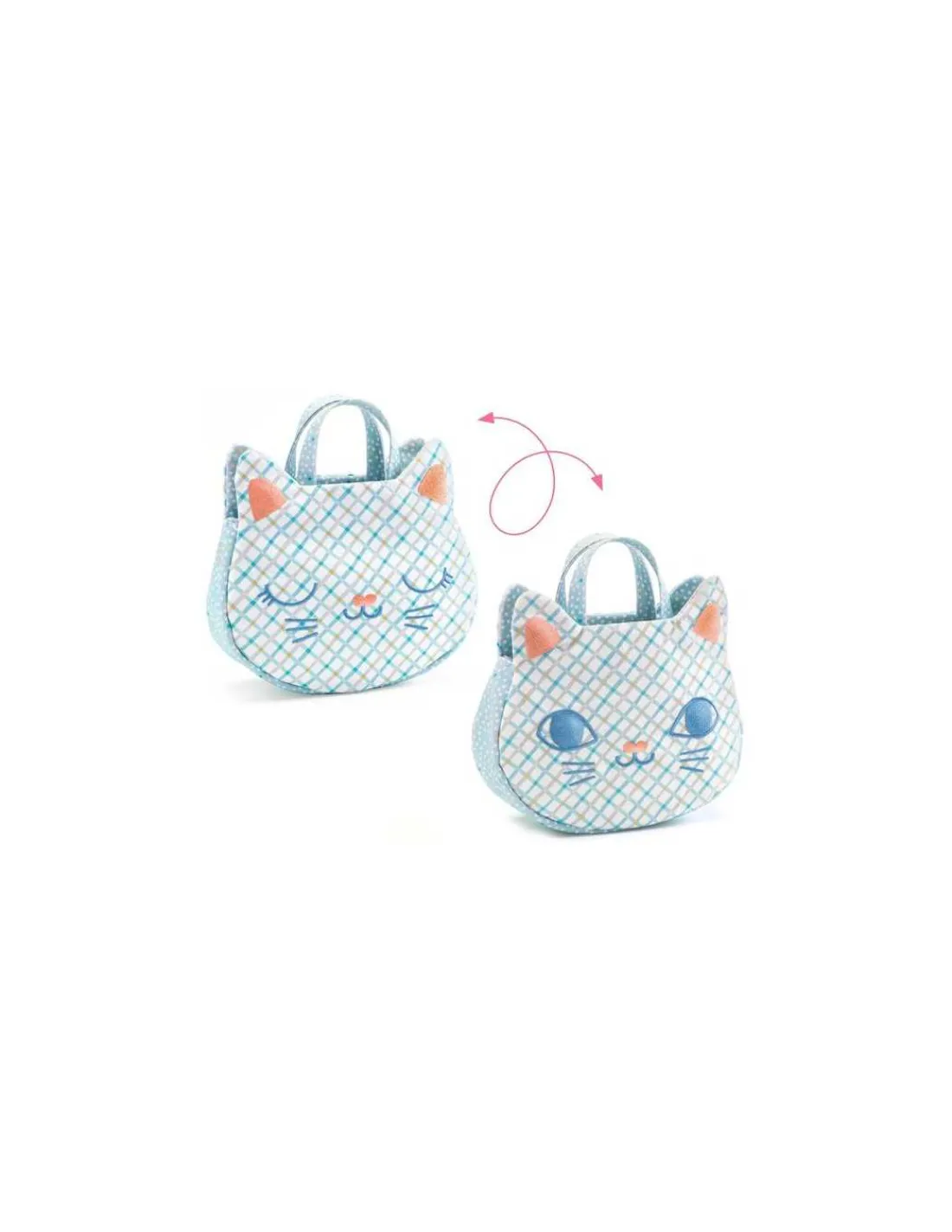 Découvrez le sac bébé de Djeco, un joli sac à main en forme de tête de chat joliment brodé incluant des accessoires indispensables pour imiter les grands dès 18 mois.