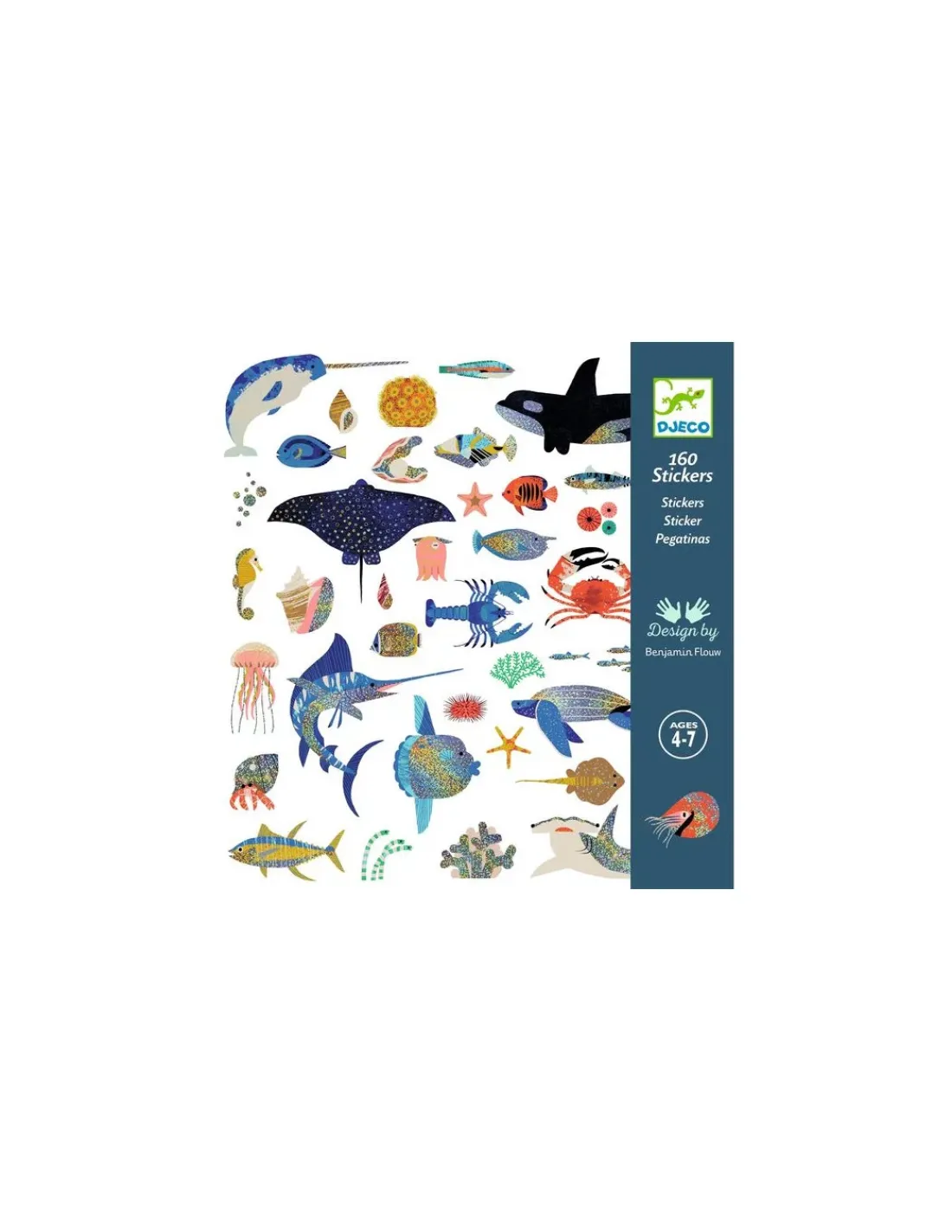 Découvrez les stickers Océan de Djeco, une pochette comprenant 4 planches avec 160 stickers métallisés sur le thème de la mer, pour les enfants de 4 à 7 ans.