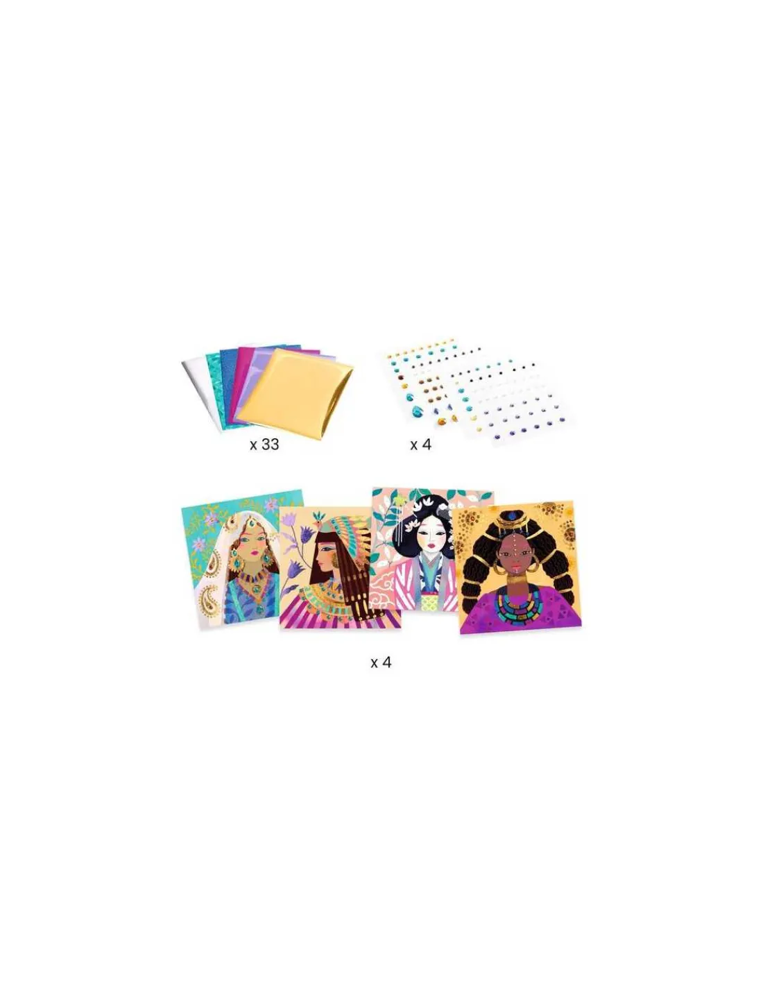 Ce comprend 4 cartes illustrées et préencollées, 1 assortiment coloré de feuilles de métal à déposer, des strass autocollants et 1 livret d’explications pas à pas en couleurs.