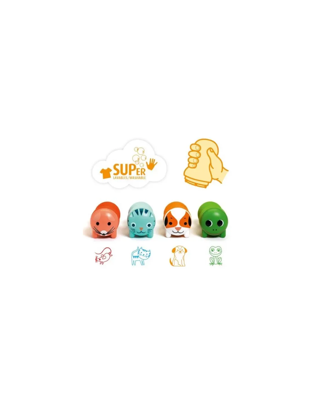 Le coffret comprend 4 tampons ergonomiques auto-encreurs: grenouille = vert, chien = orange, souris = rose et chat = bleu.