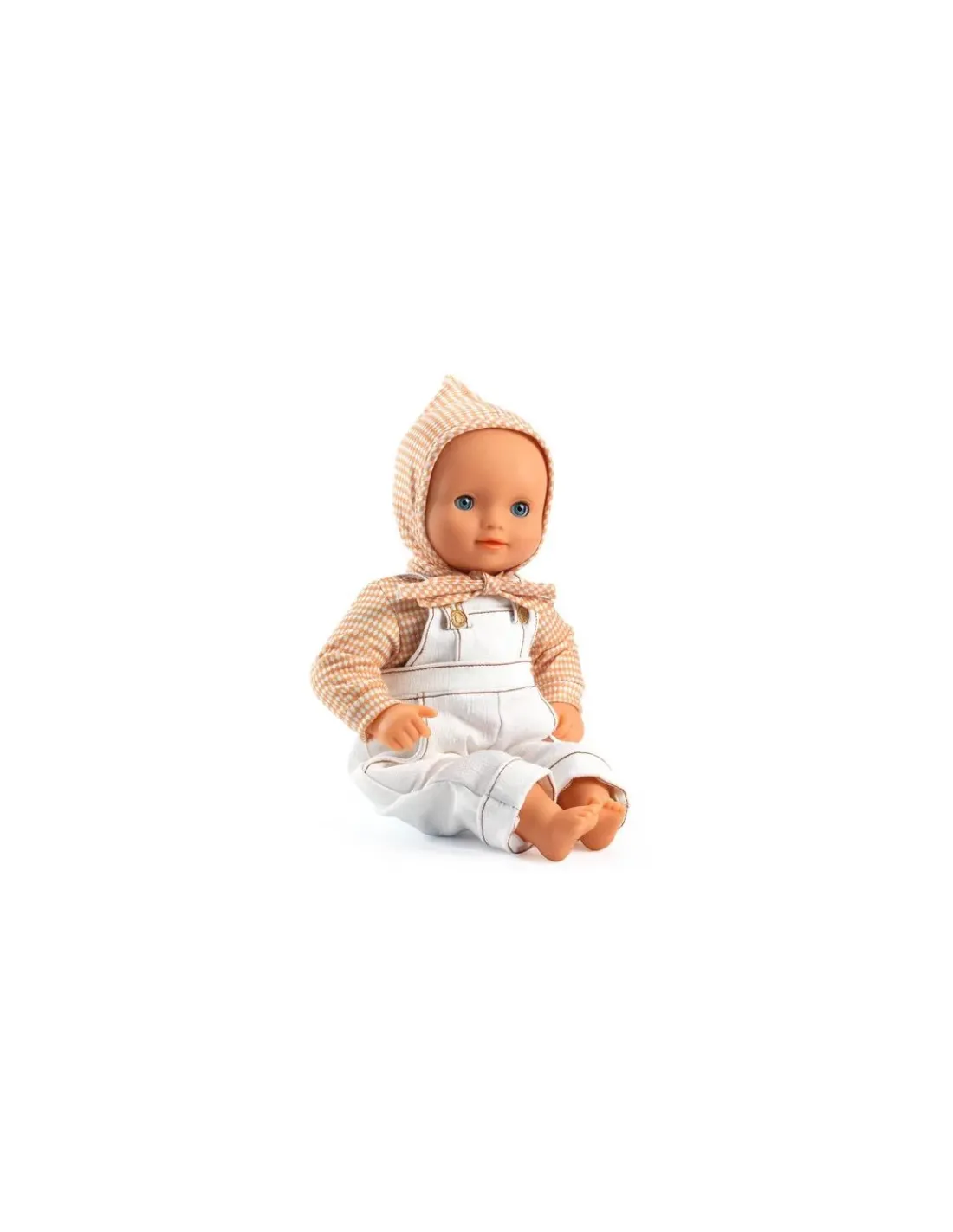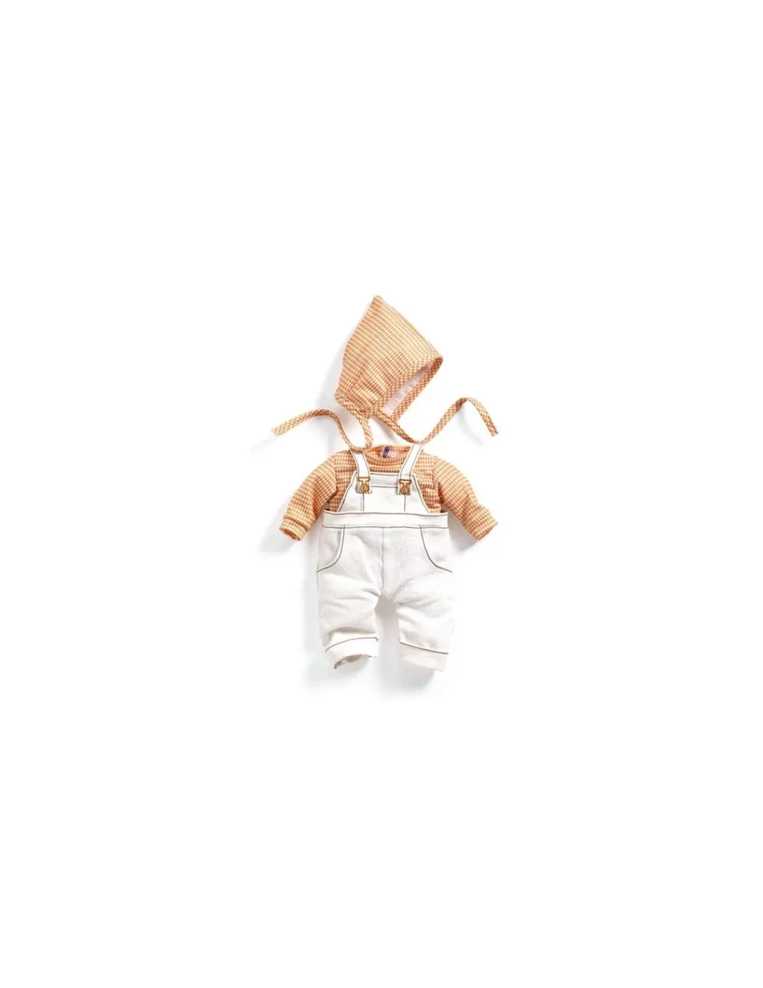 Une tenue chic et décontractée en tissu double gaze 100 % coton. Une salopette ample, qui se ferme grâce aux scratchs dissimulés derrière les attaches, permet aux petits parents d’habiller facilement la poupée. Le béguin complète joliment cette tenue.