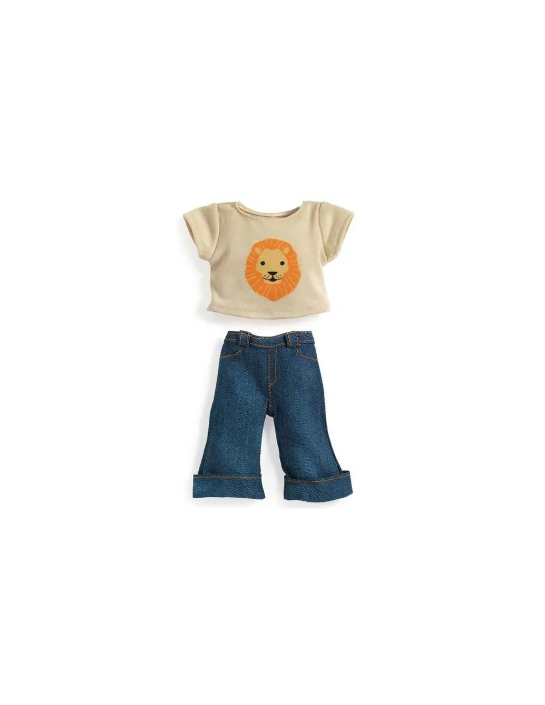 Cet ensemble se compose d’un pantalon en toile de jean avec de larges revers, apportant une touche de style décontracté et moderne. Il est accompagné d’un t-shirt à manches courtes en jersey couleur ivoire, orné d’un magnifique imprimé de lion. Les vêtements sont dotés de scratchs pratiques pour faciliter l’habillage. Une tenue qui convient aussi bien aux poupées filles qu’aux poupées garçons.