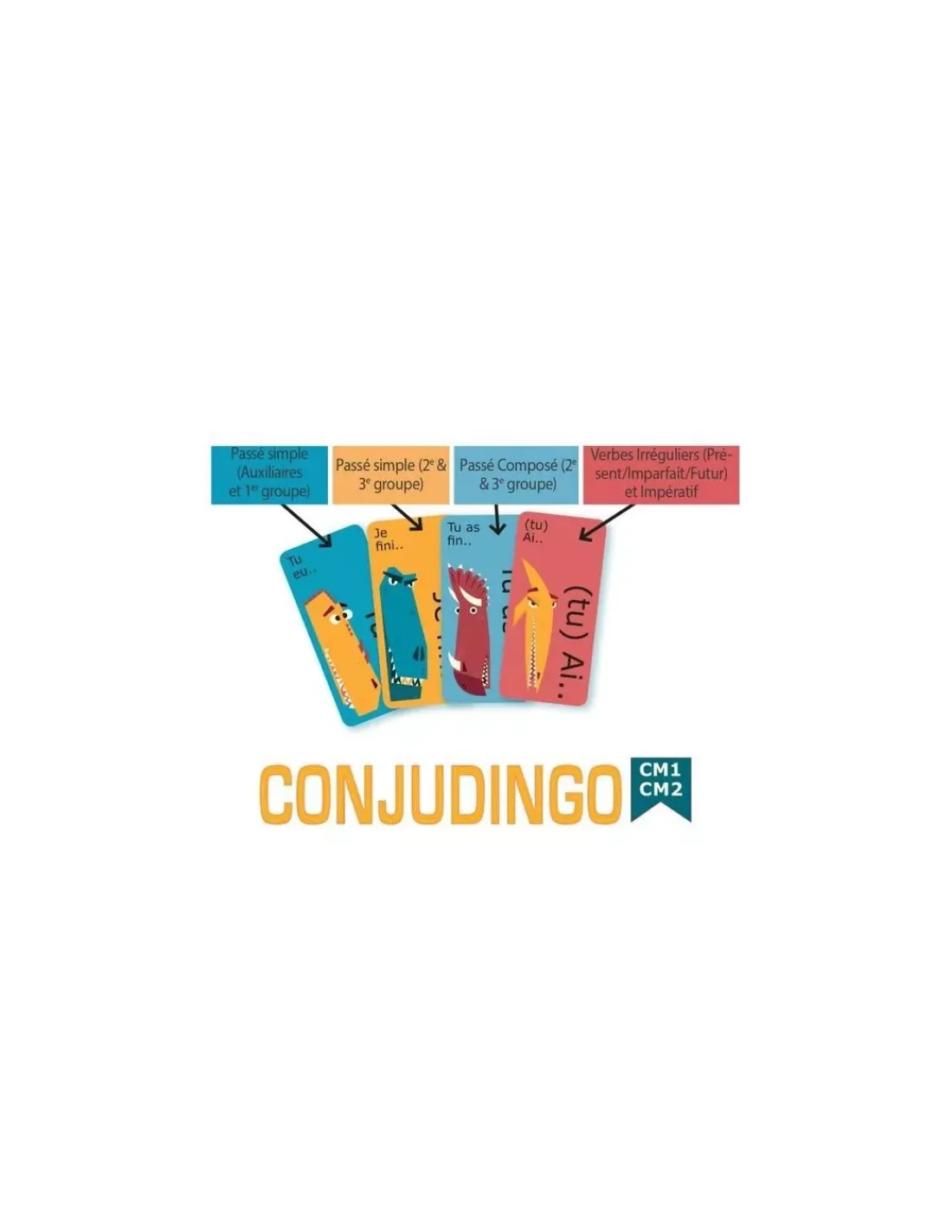 Découvrez le jeu Conjudingo CM1- CM2 de Cocktail Games, un jeu de cartes éducatif, un outil pratique et ludique pour assurer toutes les conjugaisons du programme du CM1 CM2.