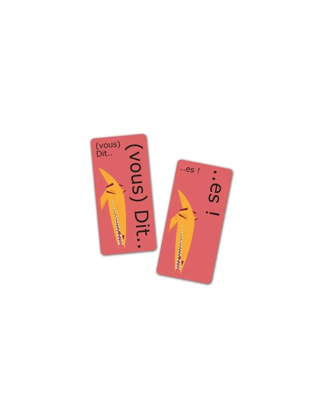 Ce jeu contient 2 cartes de règles, 4 cartes d’aide comprenant des verbes conjugués et plus de 100 cartes de conjugaison petit format.