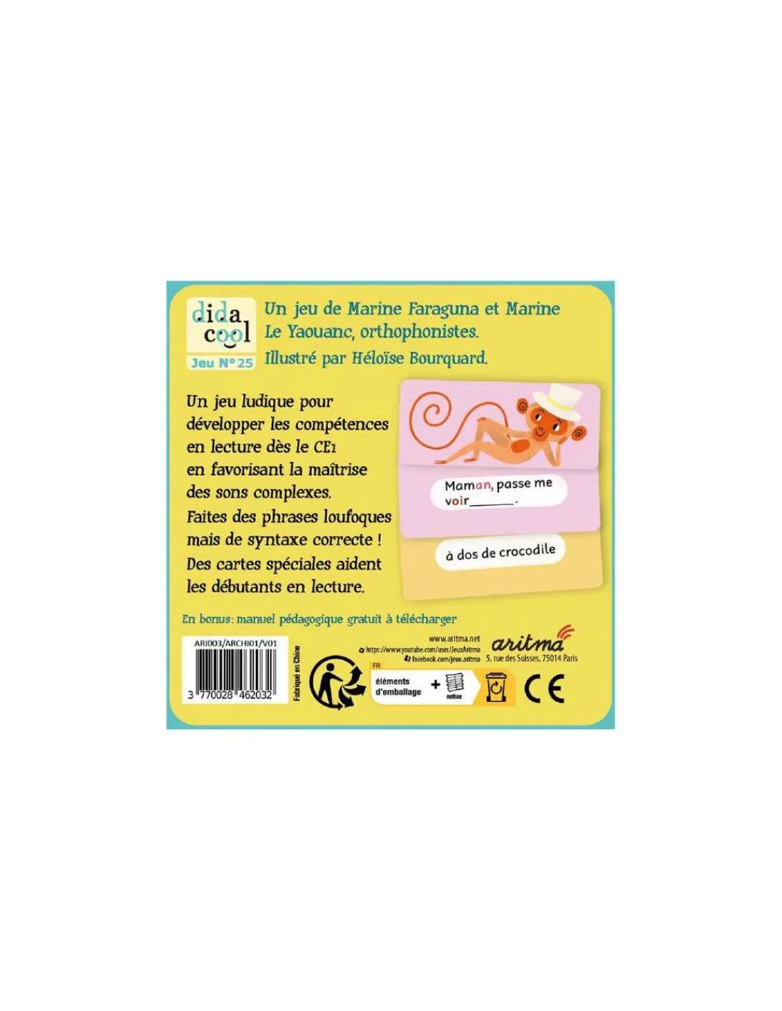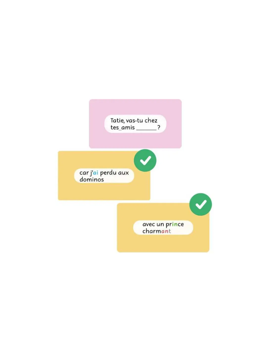 La boite de jeu comprend 100 cartes phrases recto/verso, 8 cartes « Aide » facilitant la lecture des sons difficiles pour jouer au autonomie sans adulte et 3 cartes « Règles du jeu ».