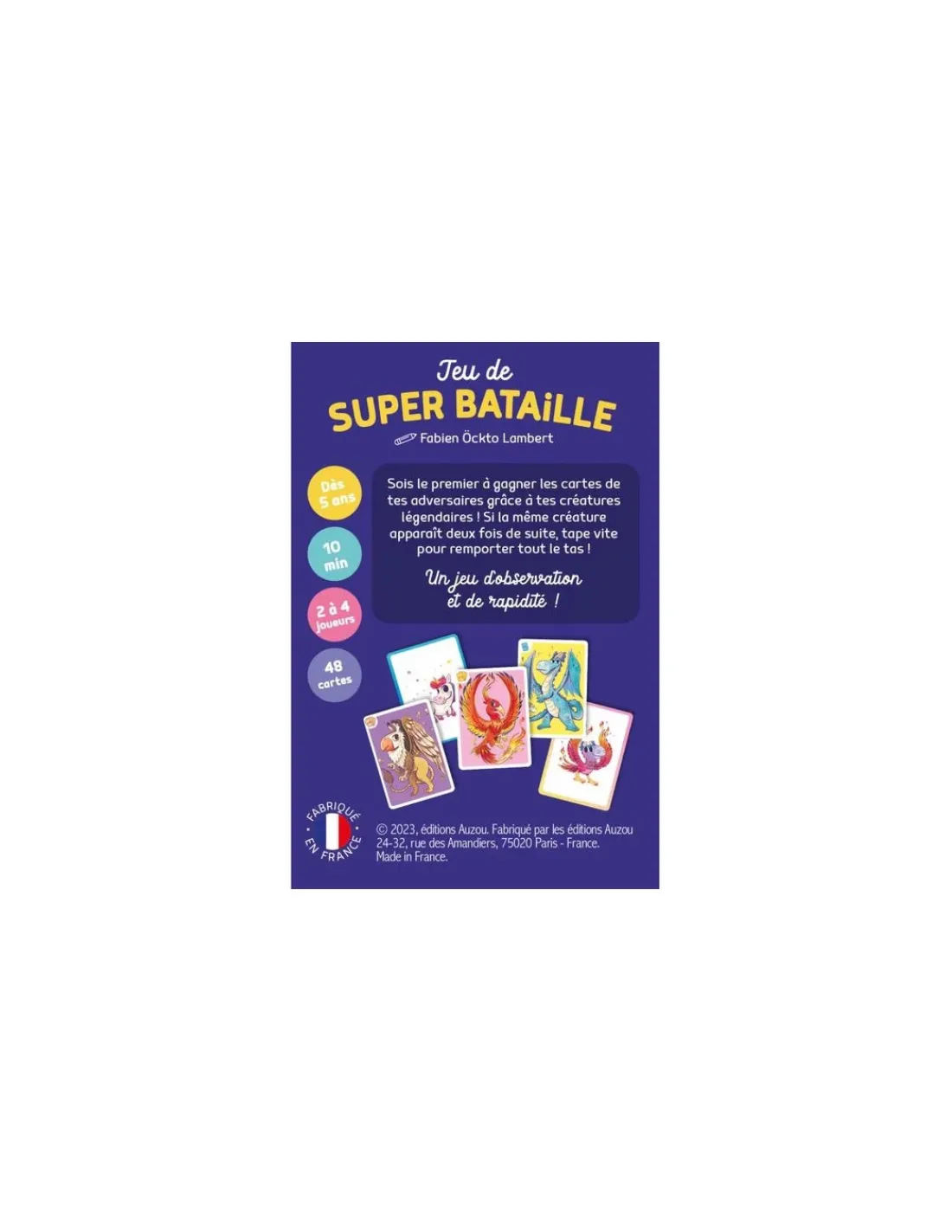 Découvrez le jeu de super bataille de Auzou, un jeu de cartes d’observation et de rapidité pour jouer de 2 à 4 joueurs à partir de 5 ans. Bienvenue dans l’univers merveilleux des animaux légendaires! L’adaptation de la bataille corse pour les plus petits.